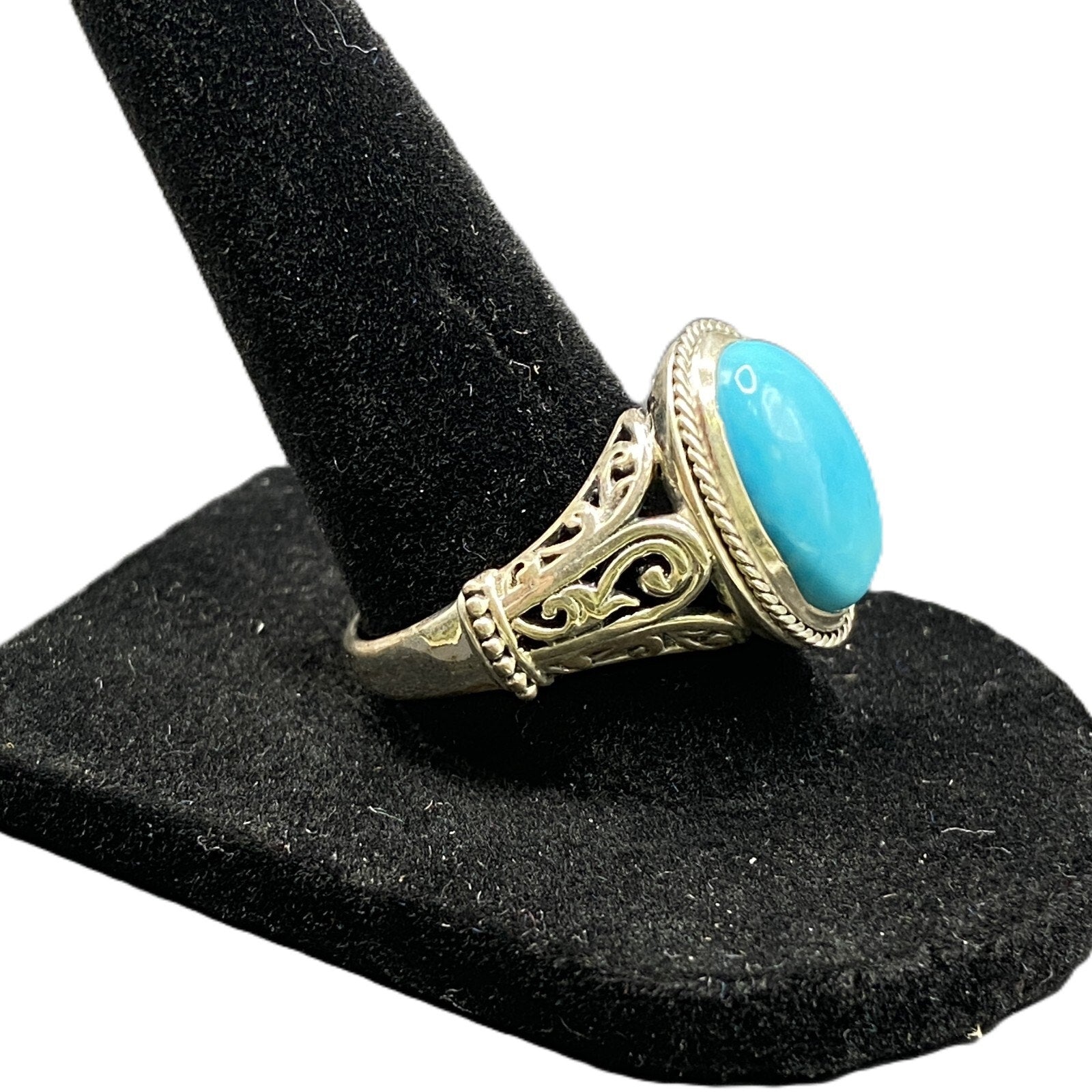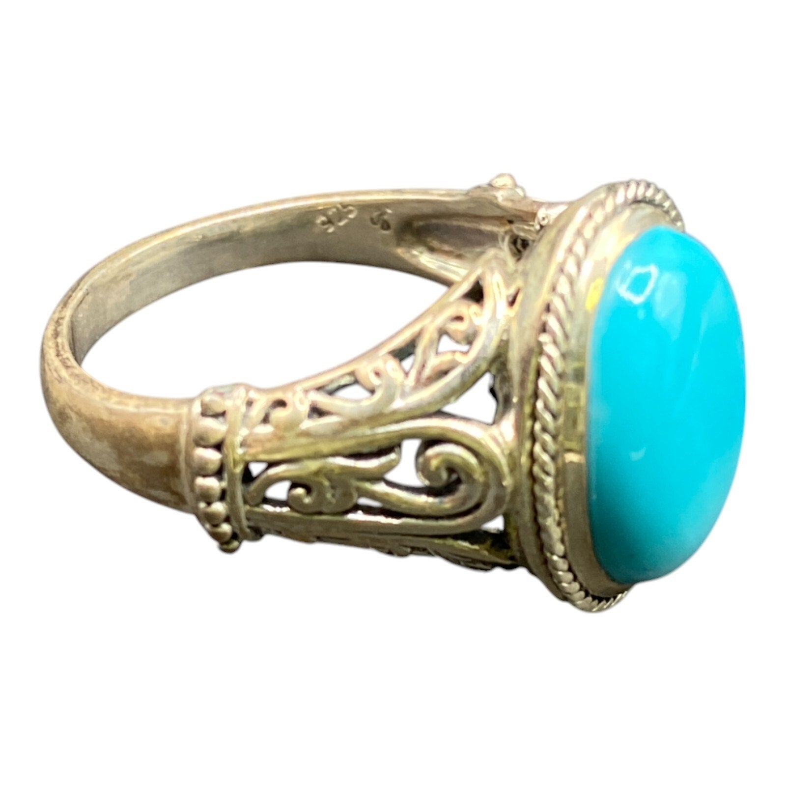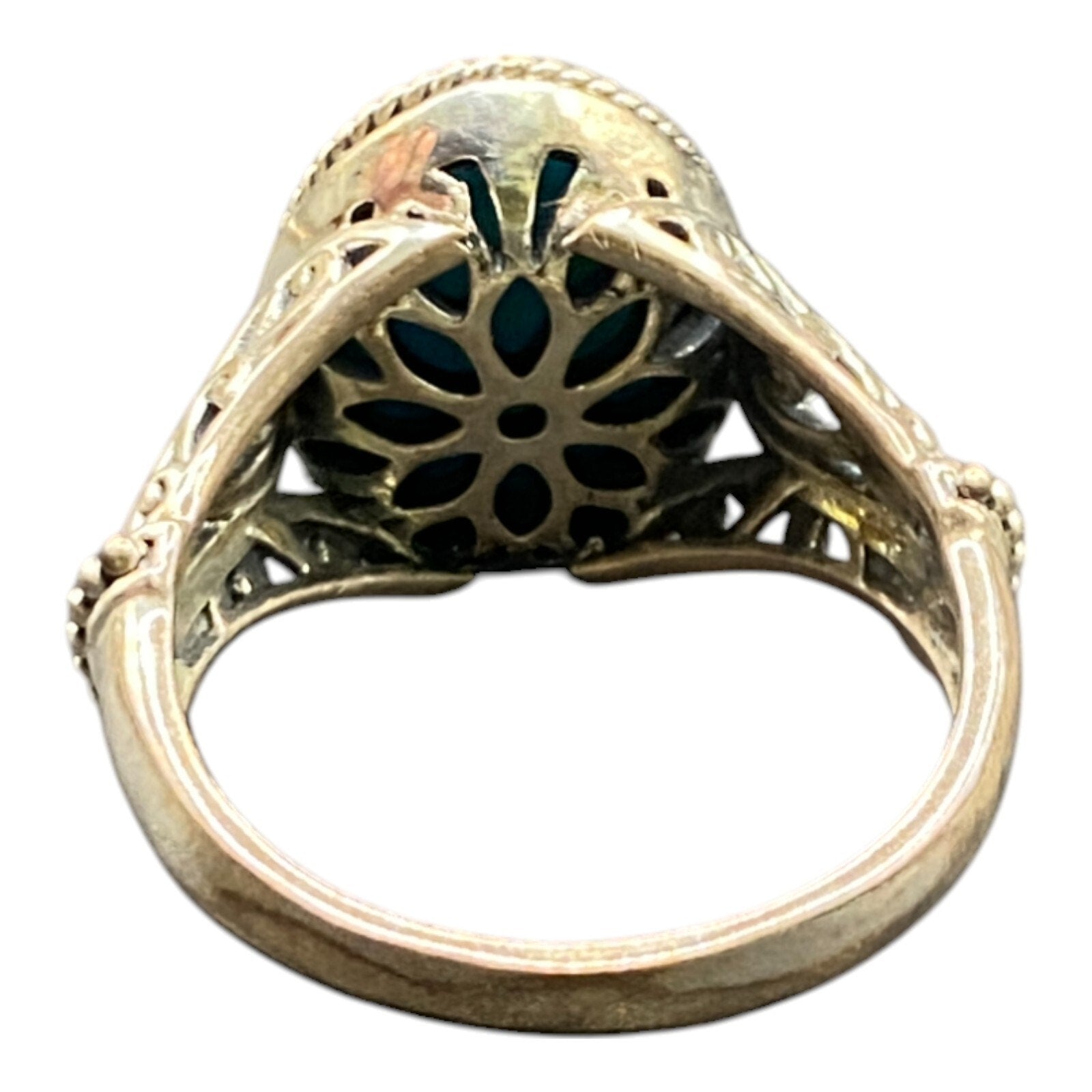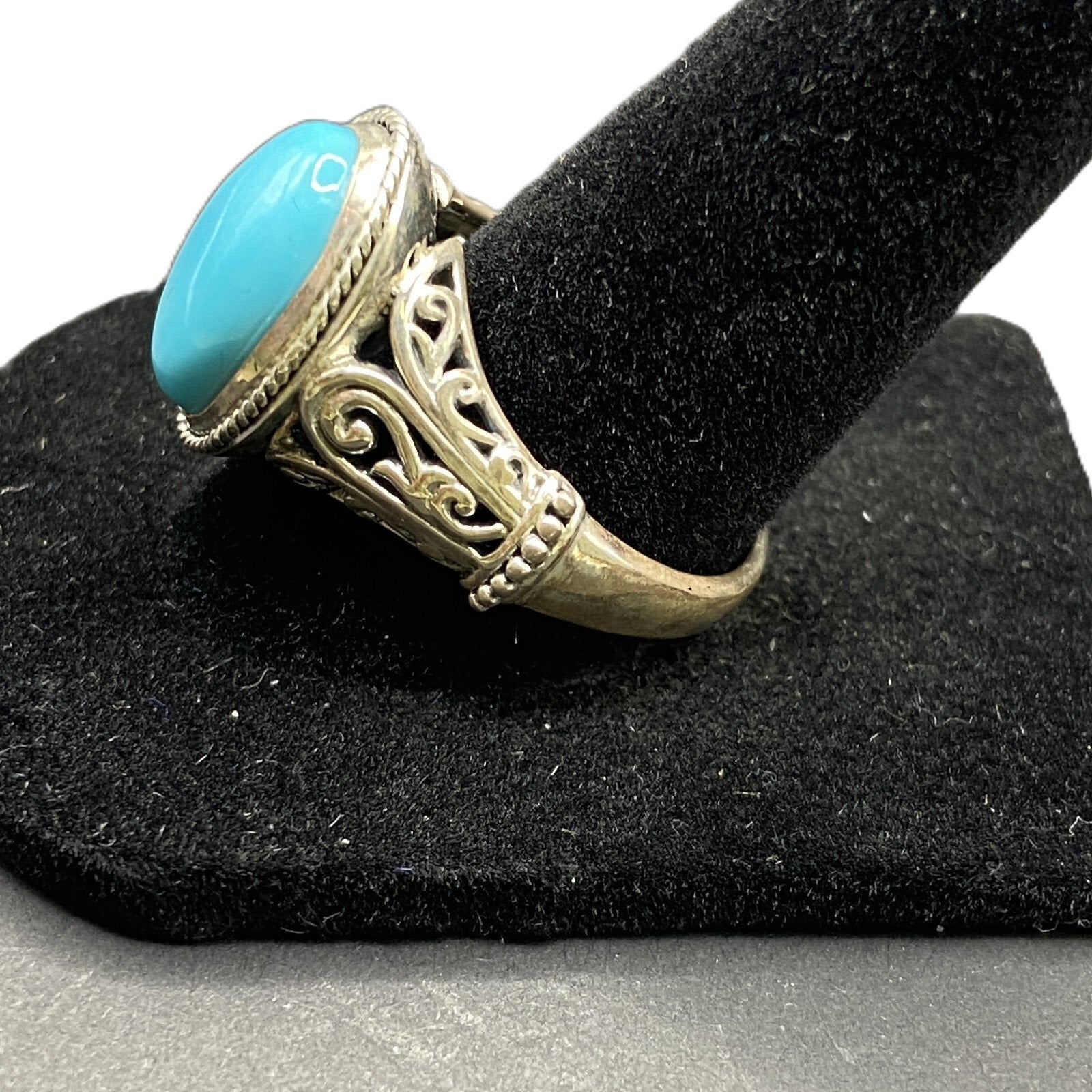 925 Sterling Silver Filigree Oval Turquoise Gemstone Cocktail Ring Size 8 3/4
