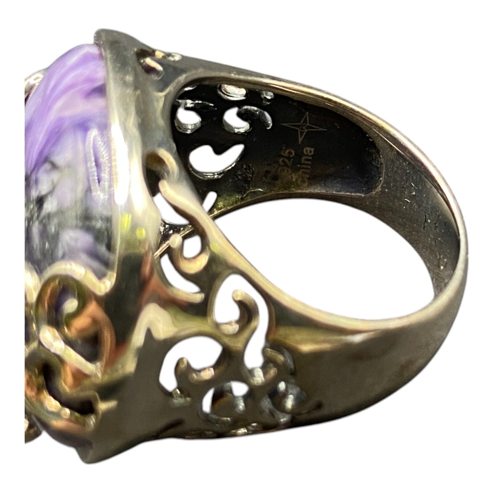 925 Sterling Silver Oval Marbled Purple Russian Charoite Crystal Gemstone Ring Size 7