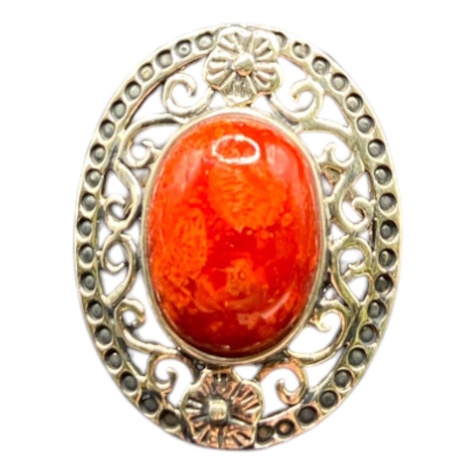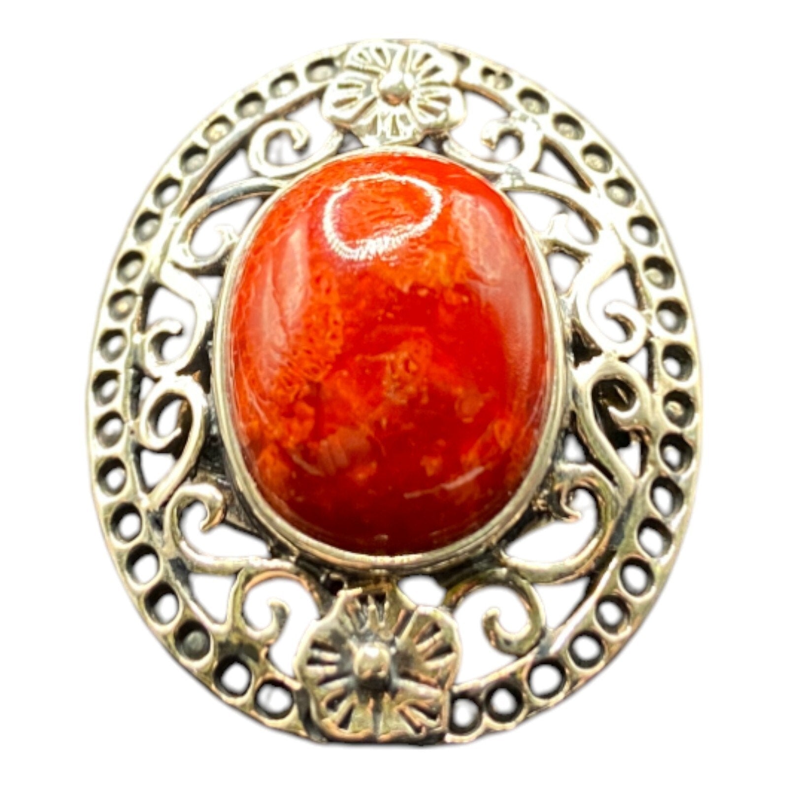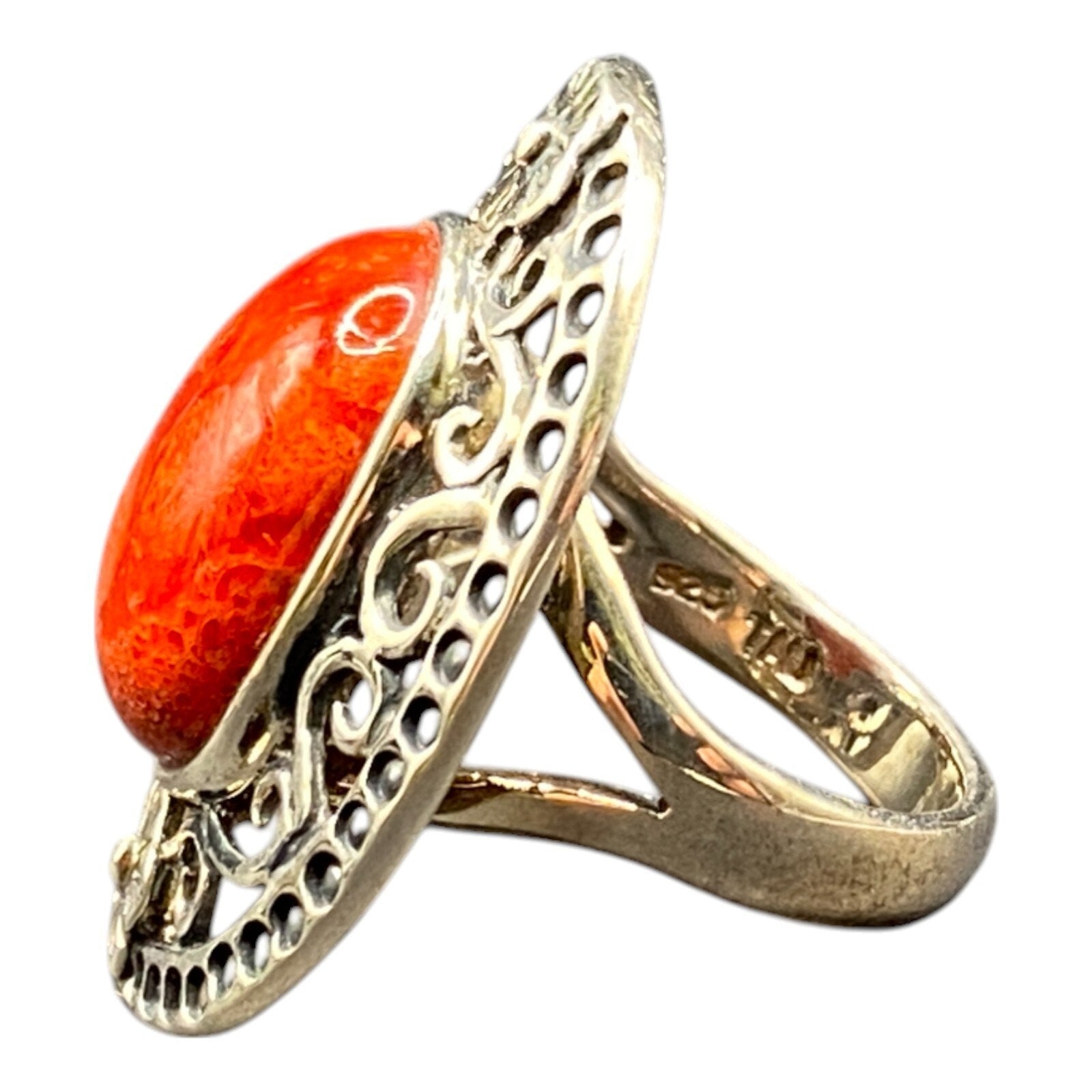 925 Sterling Silver Ring Sponge Coral Filigree Orange Oval Gemstone Size 7