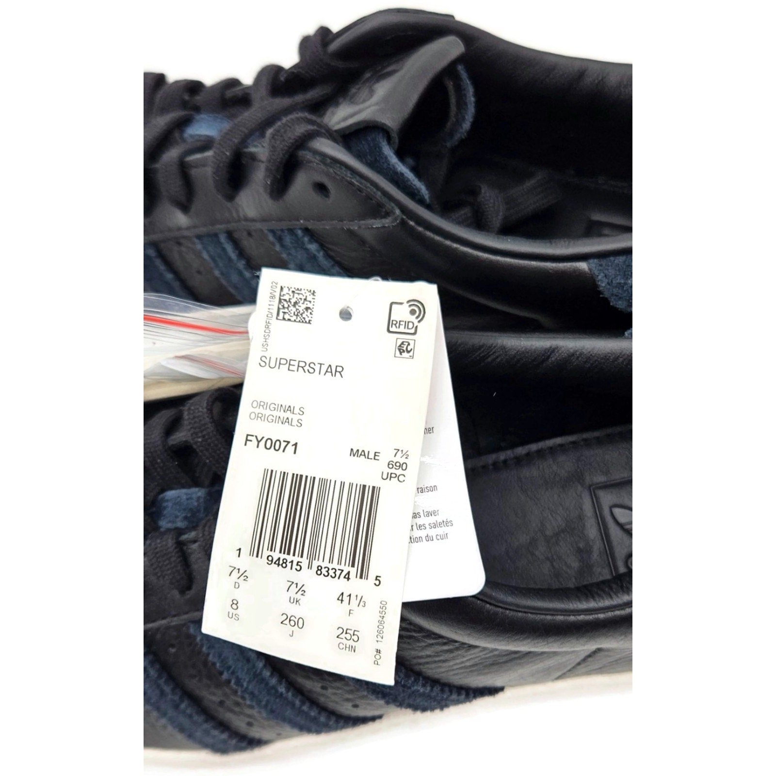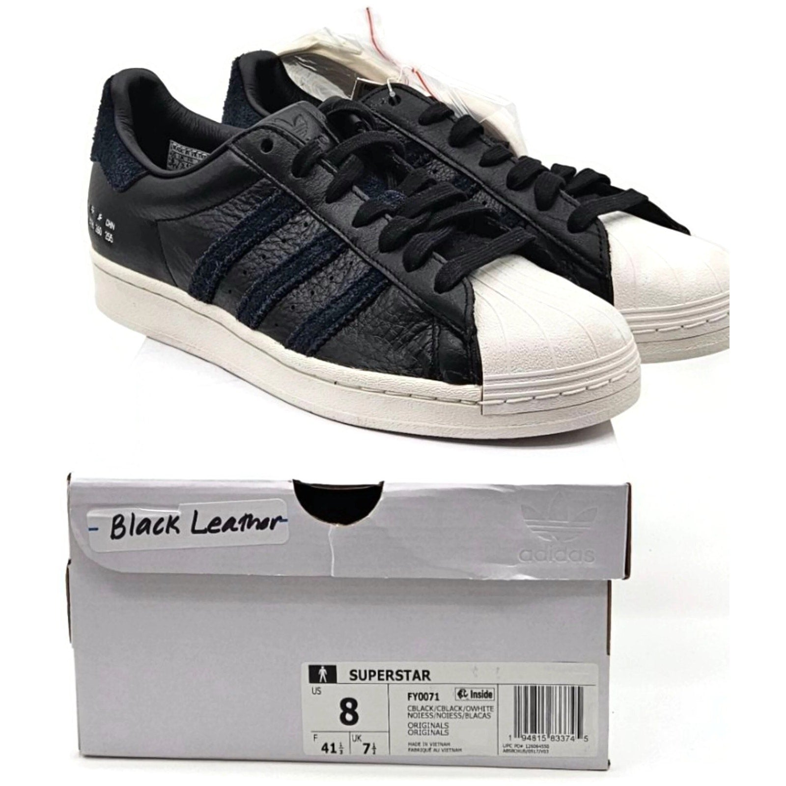 New Adidas Superstar FY0071 in black leather with the classic white shell toe. Size US 8 (EU 41 1/3, UK 7 1/2). Includes factory tags and an extra set of white laces (sealed). Clean outsoles and uppers—see photos for details and sizing label.