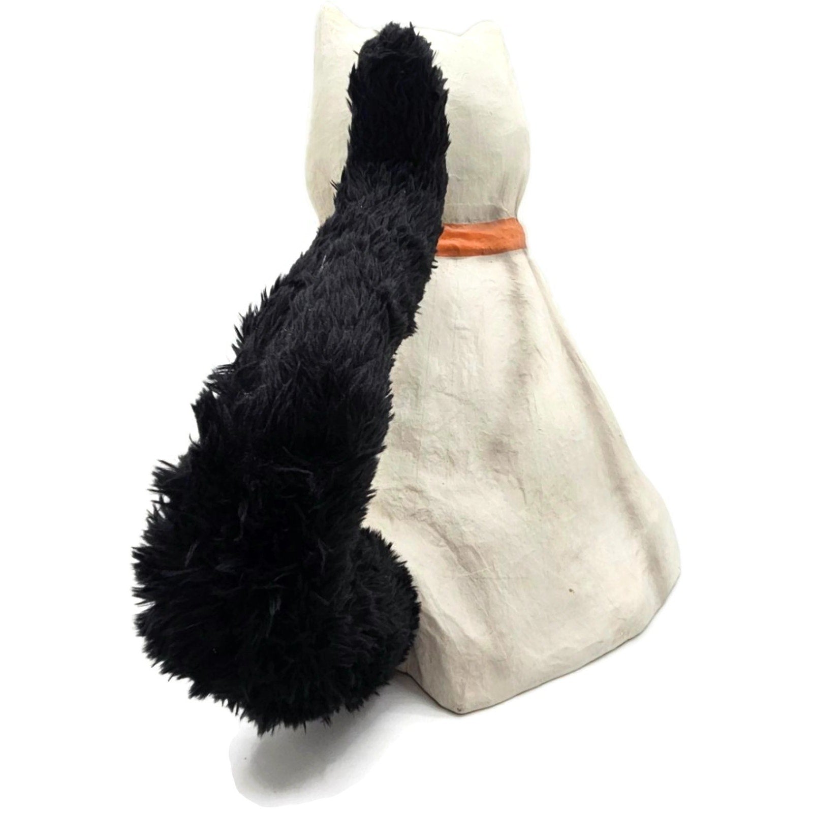 Bethany Lowe “Large Casper Ghost Cat” Halloween décor piece, approximately 17″ tall × 16.5″ wide, in crafted paper mache with hand-painted detail, a plush chenille tail, and the signature orange collar with gold glittered star. This whimsical figure evokes vintage scrapbook / Halloween nostalgia.