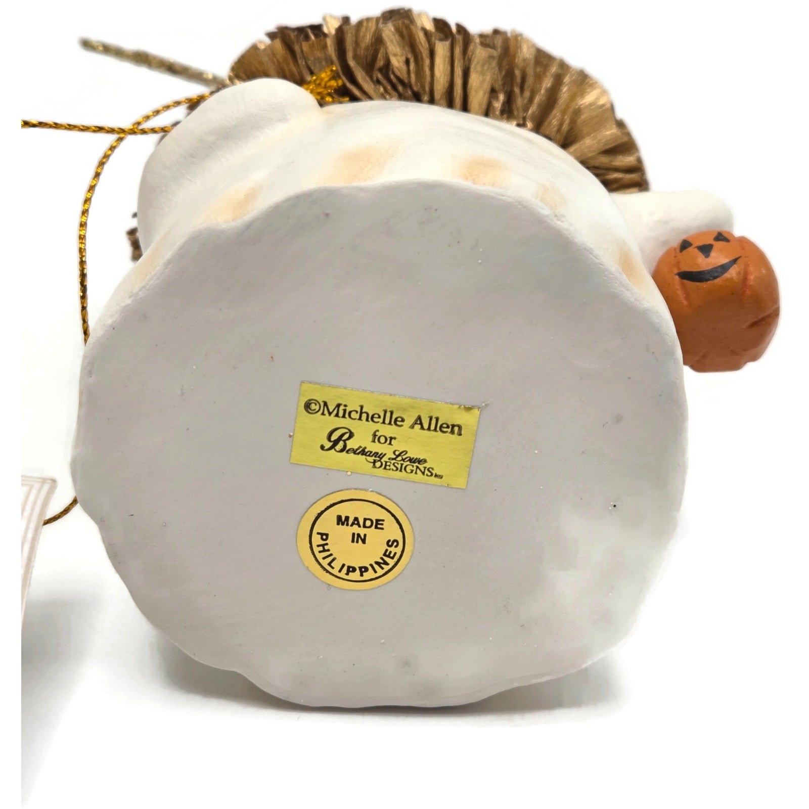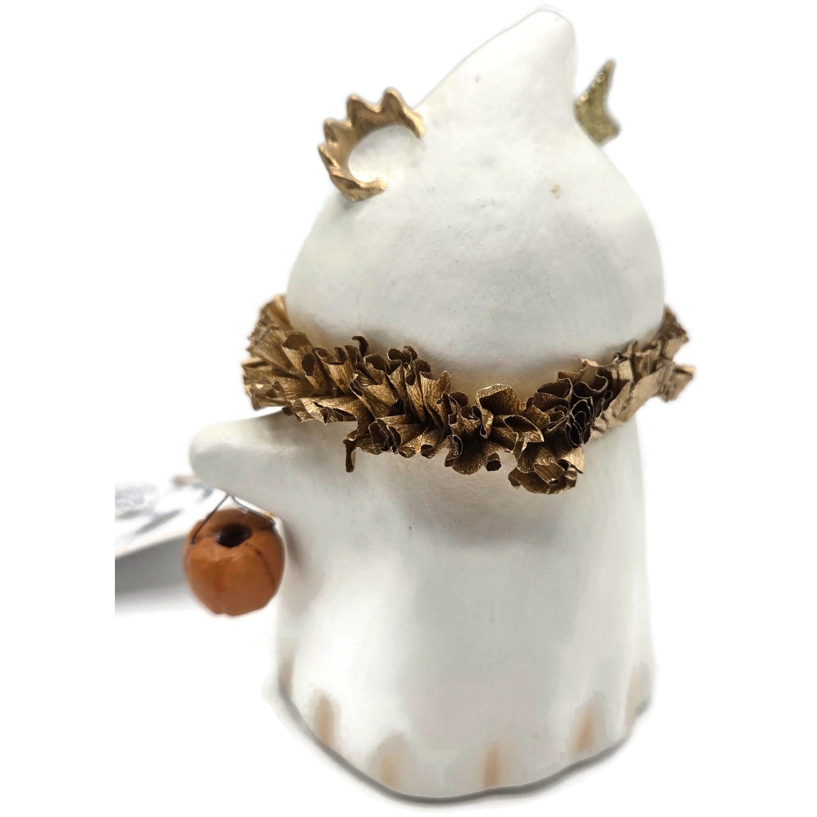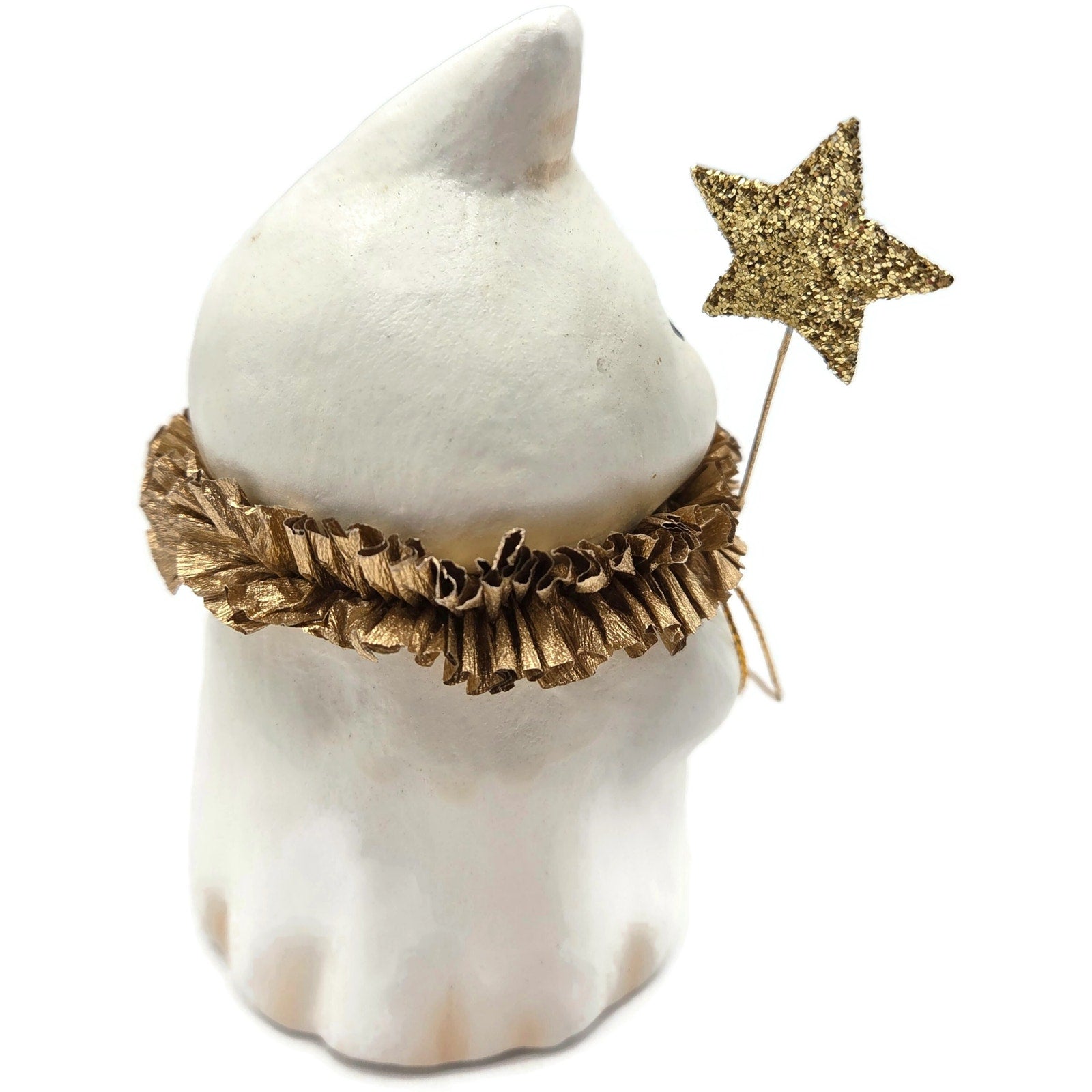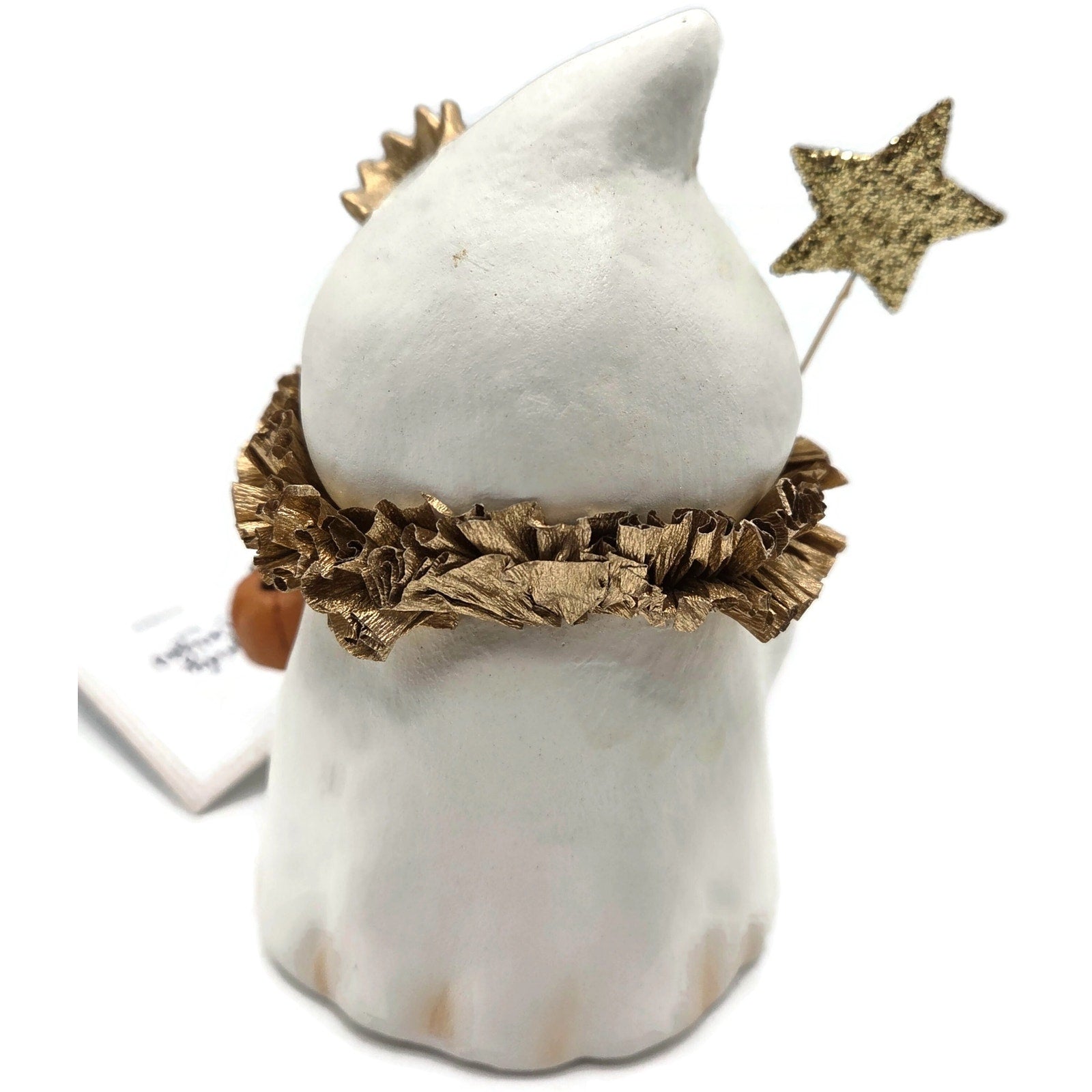 Charming and collectible Bethany Lowe Designs “Princess Boo” ghost, created by Michelle Allen under Raggedy Pants Designs. This whimsical Halloween piece features a sweet ghost holding a glittered star wand and a tiny jack-o'-lantern pail, finished with a metallic crepe paper ruffle collar and crown detail.