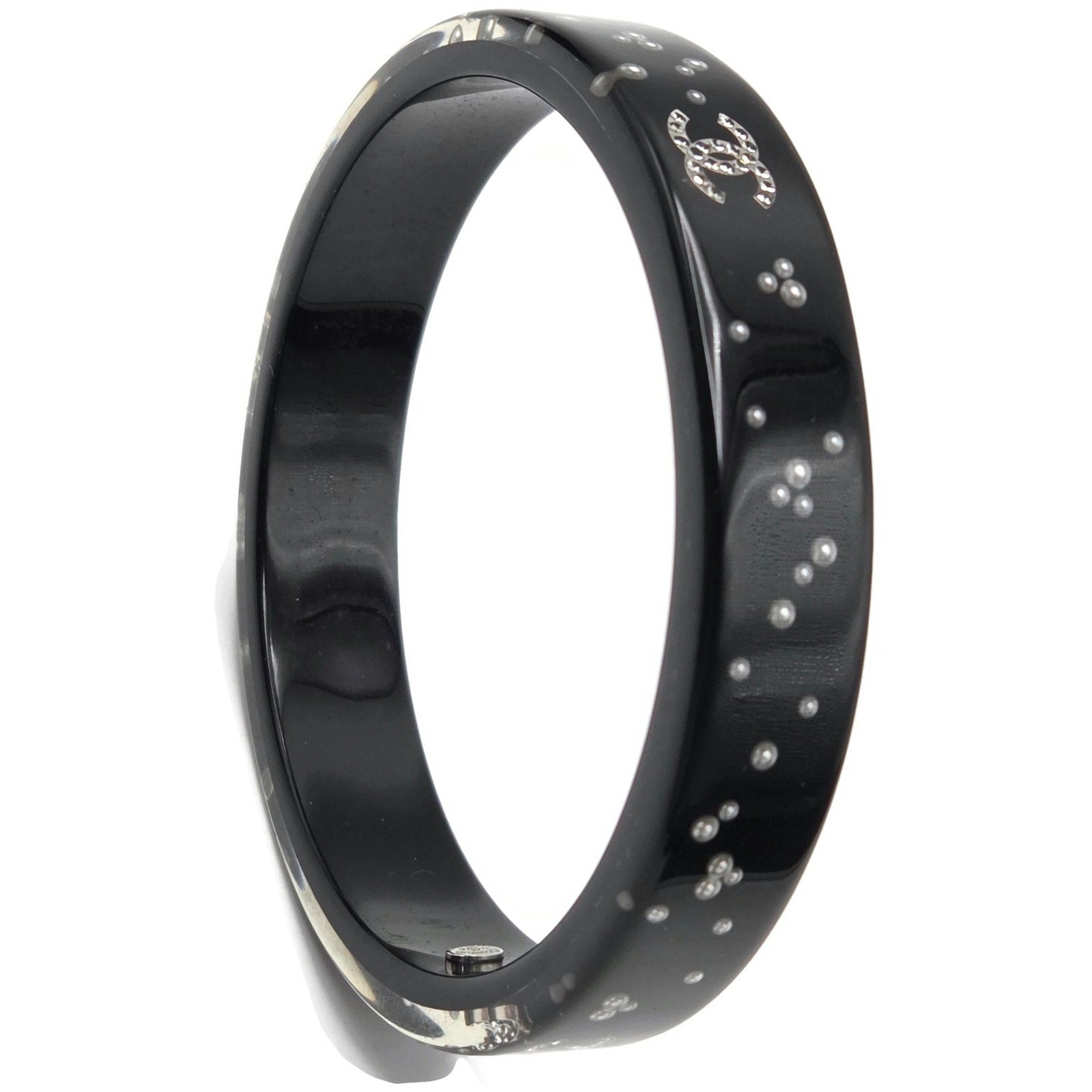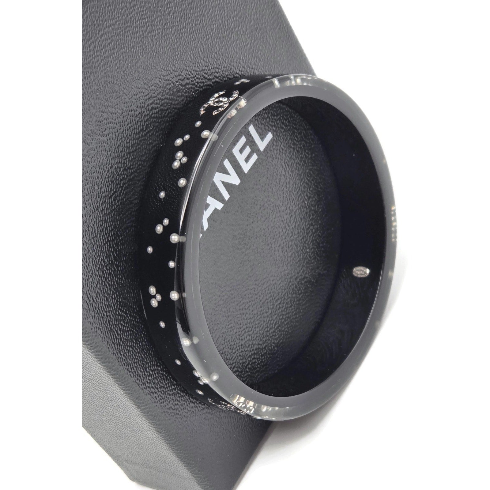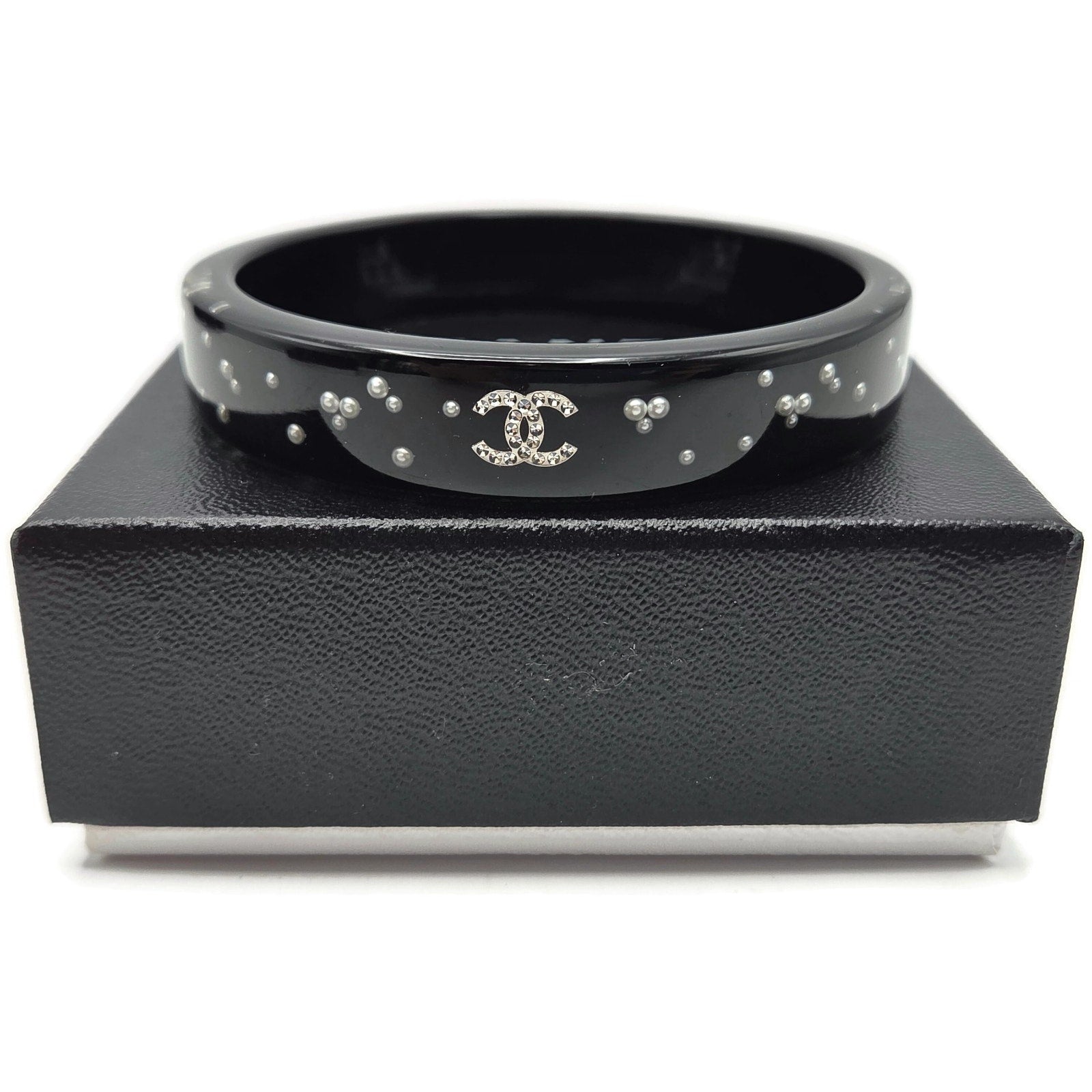 Chanel Black Resin Faux Pearl Crystal CC Logo Details Bangle Bracelet Jewelry