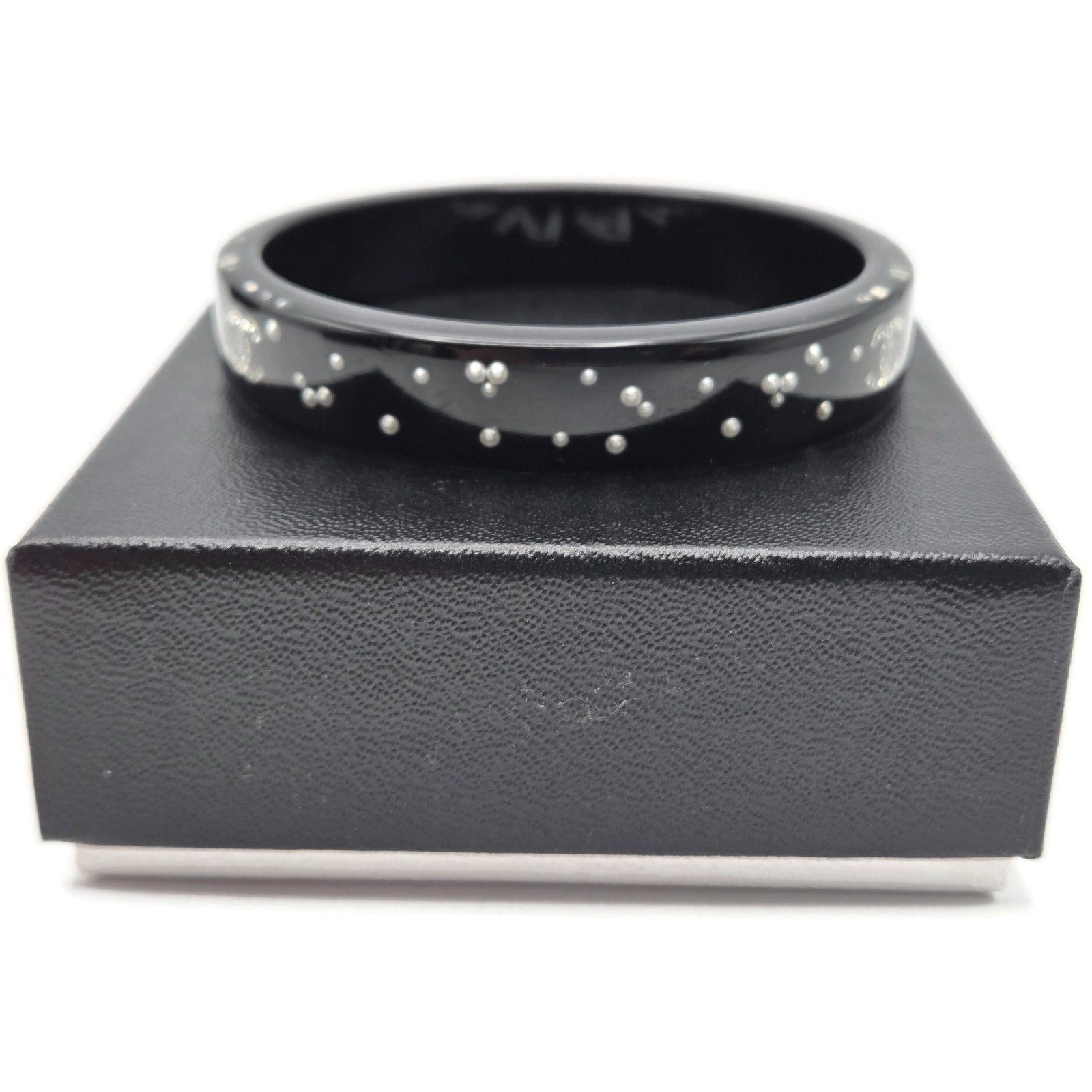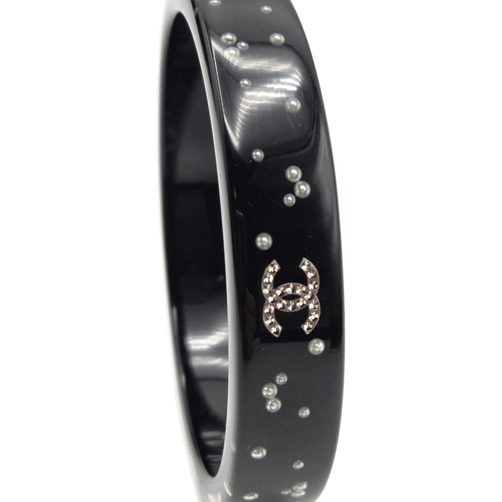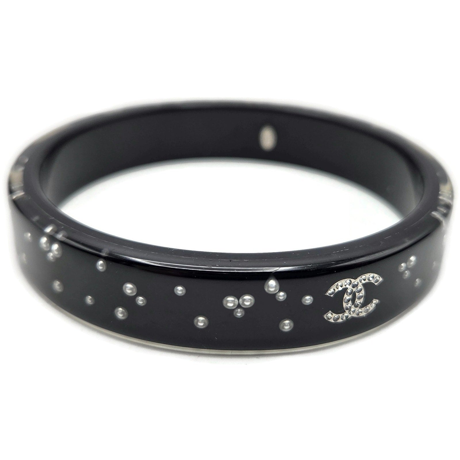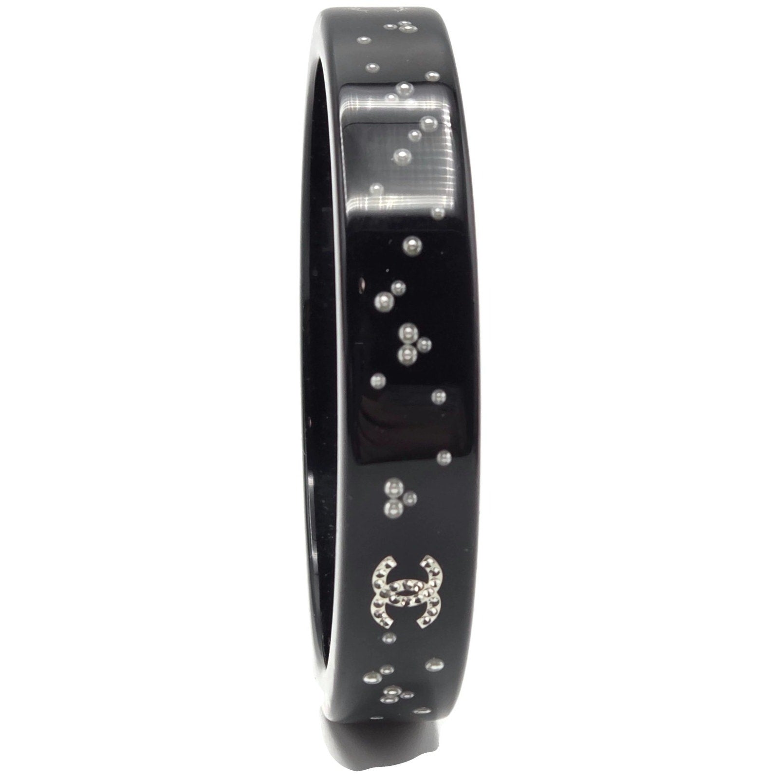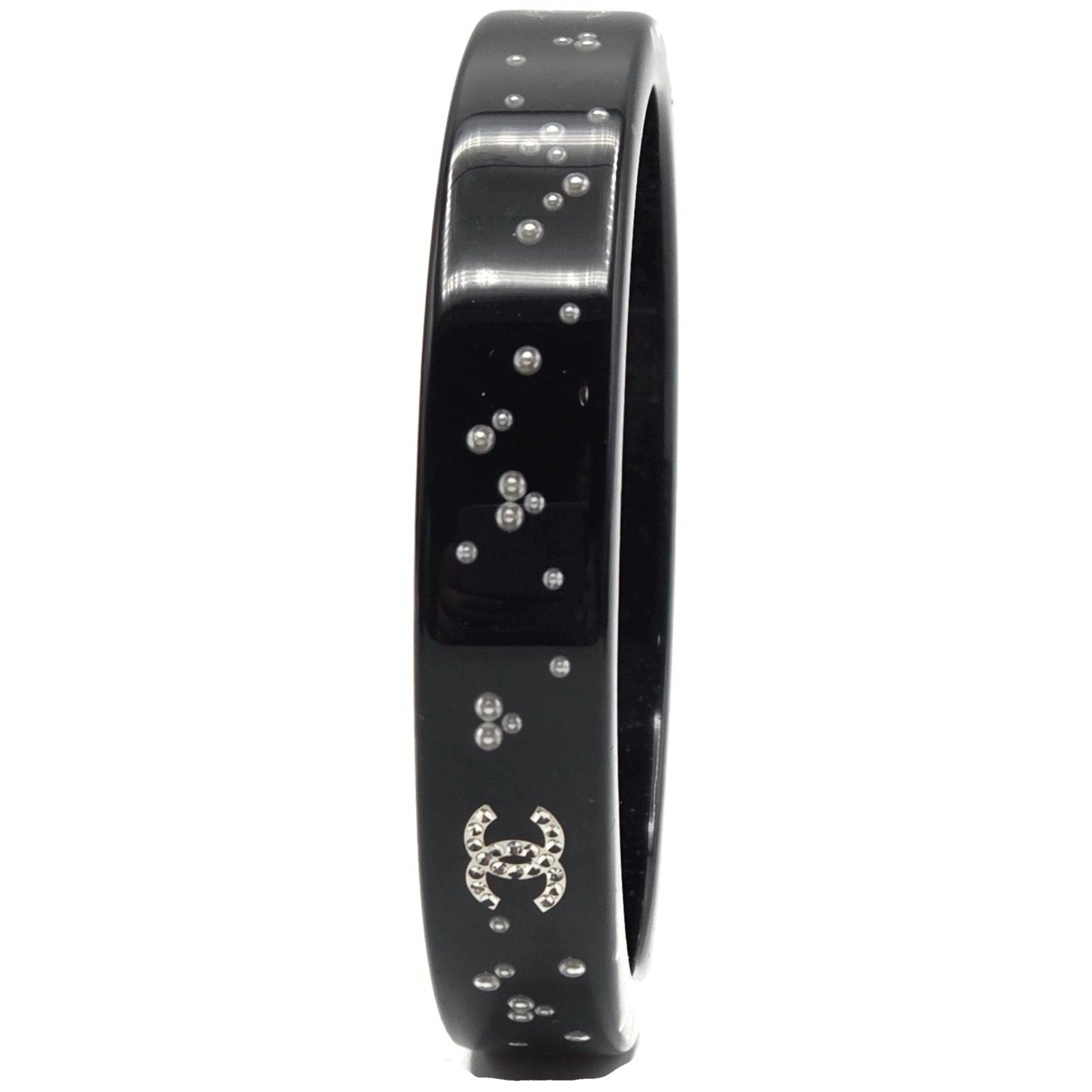 Authentic Chanel resin bangle from the Autumn 2012 collection (stamp “Chanel 12A Made in France”). Glossy black bracelet dotted with embedded faux pearls and a silver-tone CC logo. Easy slip-on style—great stacked or solo for a subtle Chanel signature.