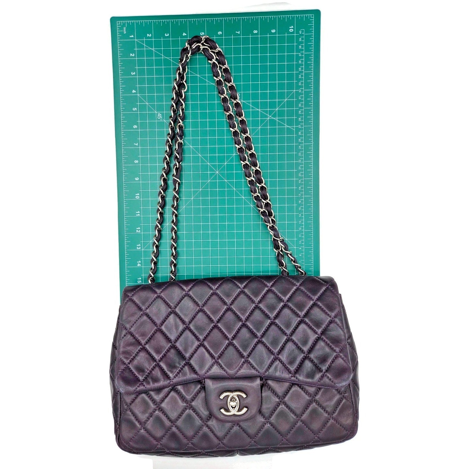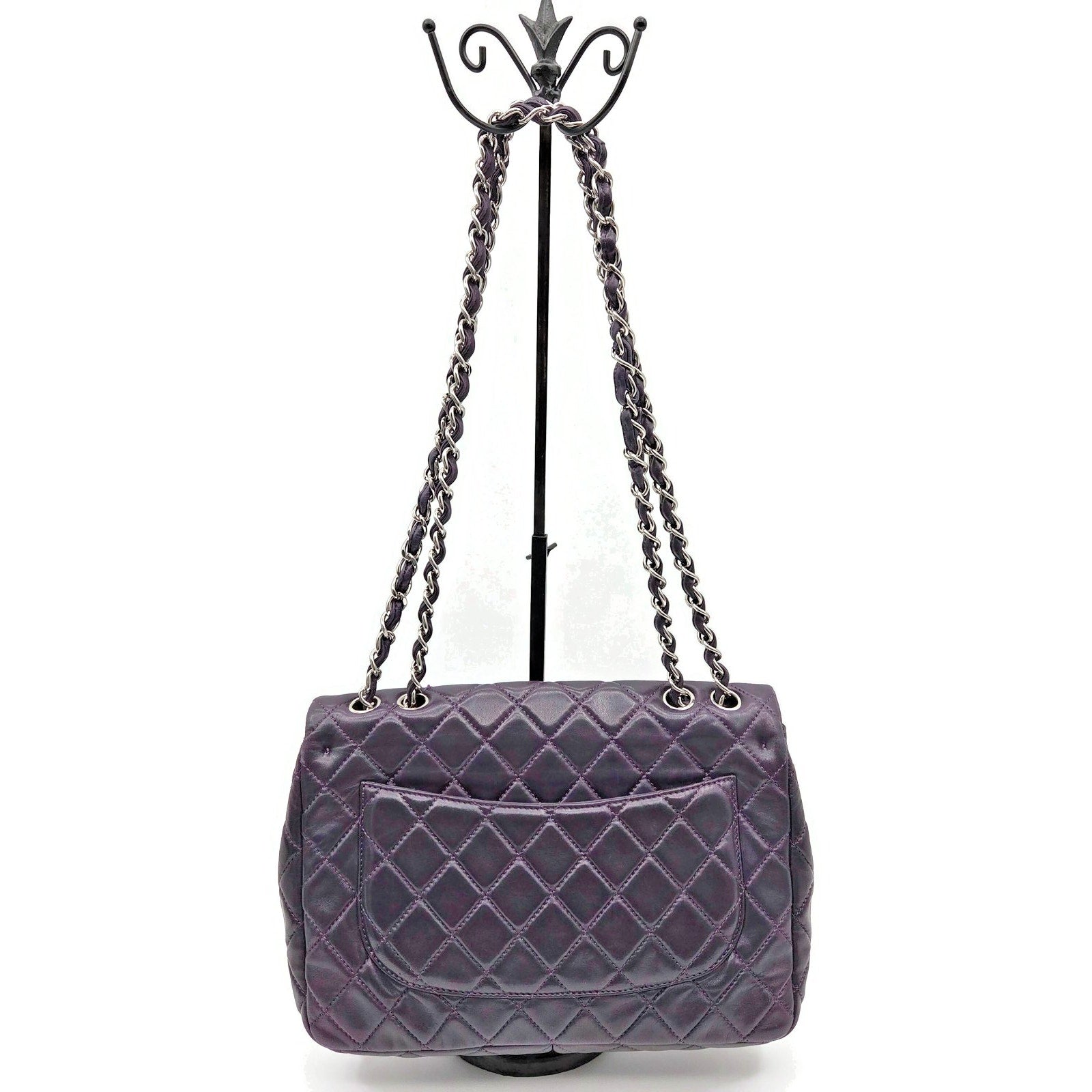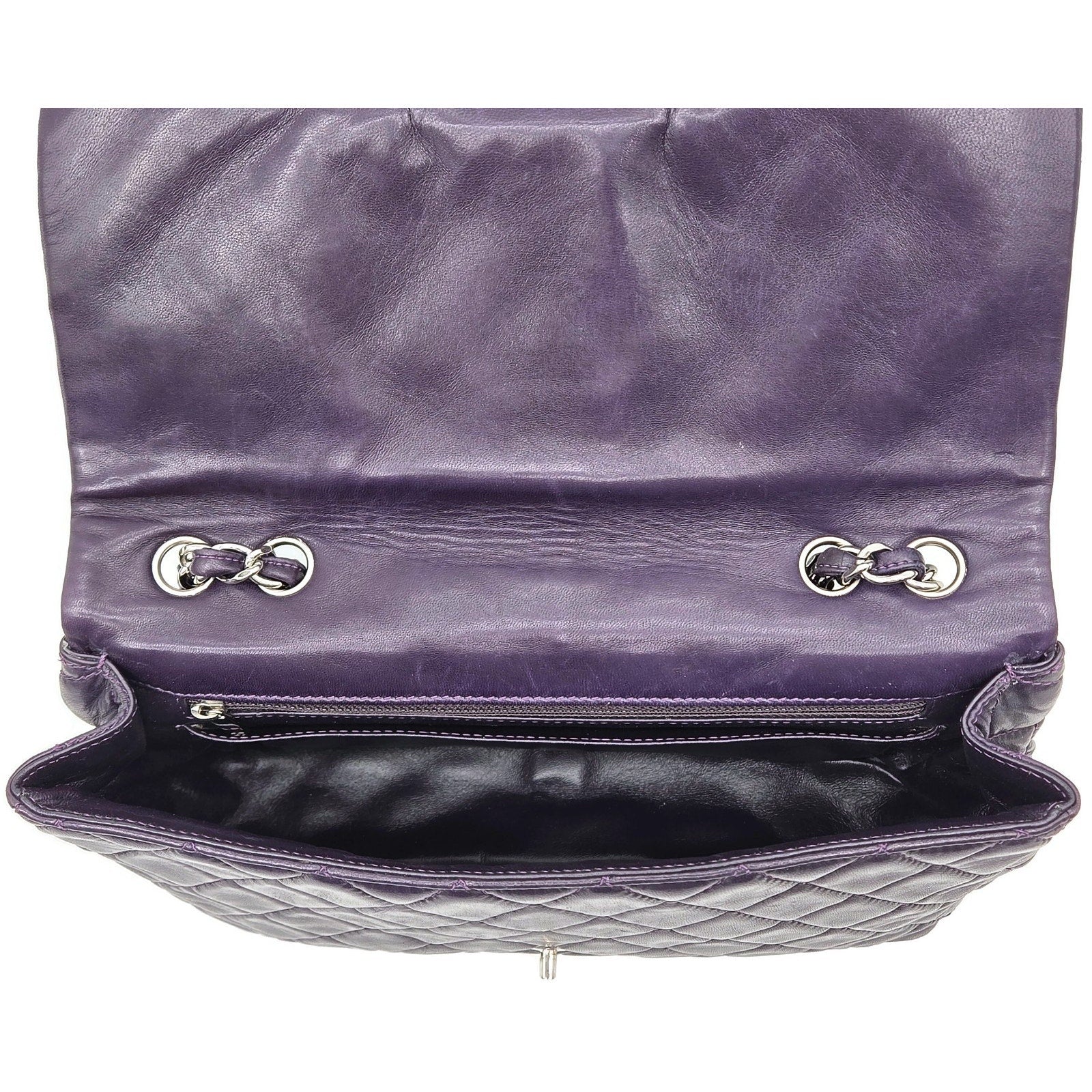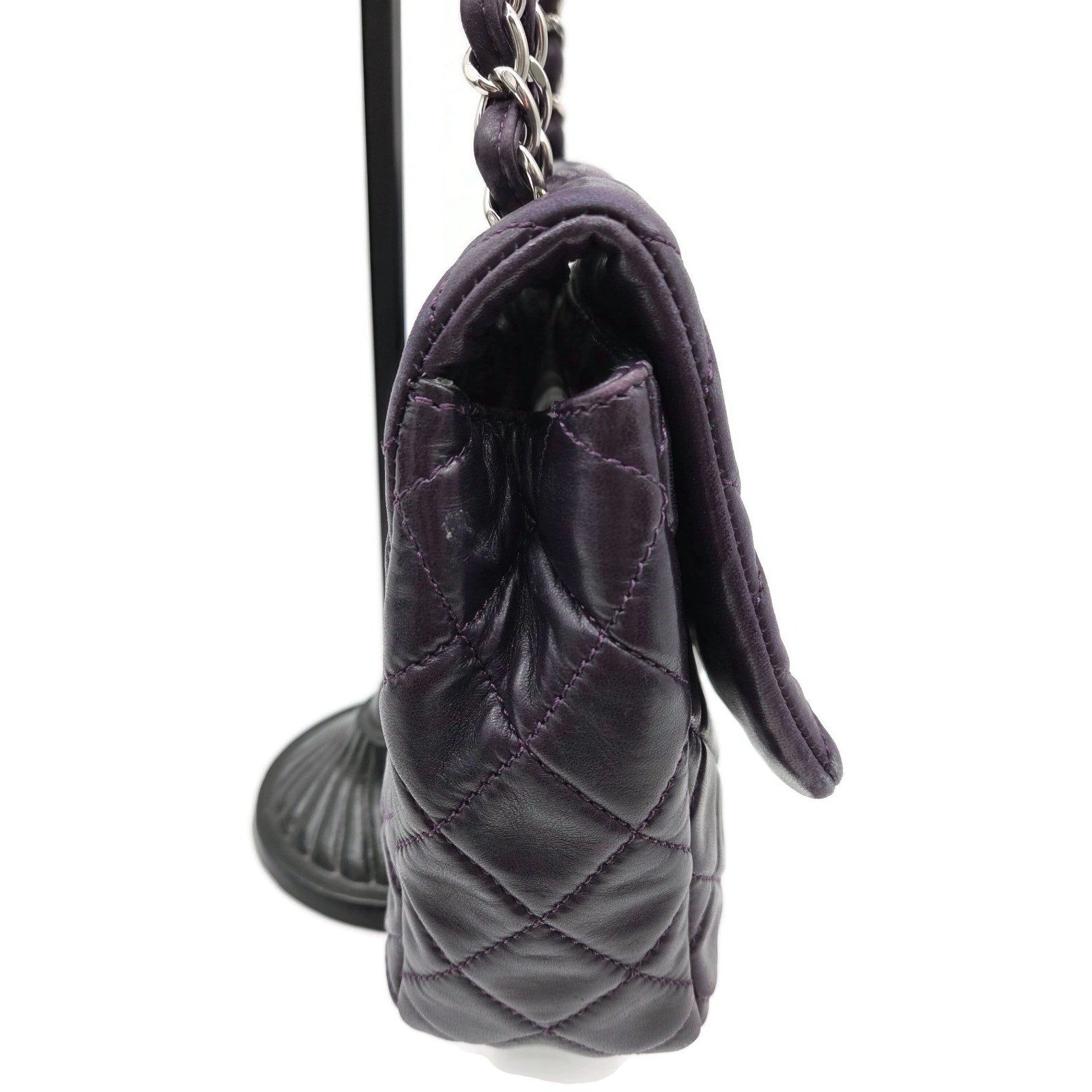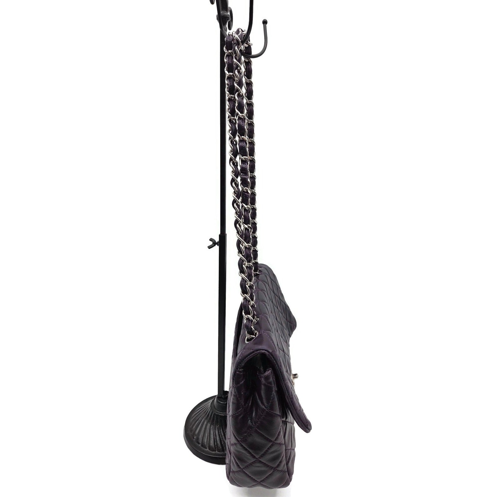 Chanel Classic Flap handbag crafted in rich deep purple quilted lambskin leather with silver tone hardware and signature CC turn lock closure.