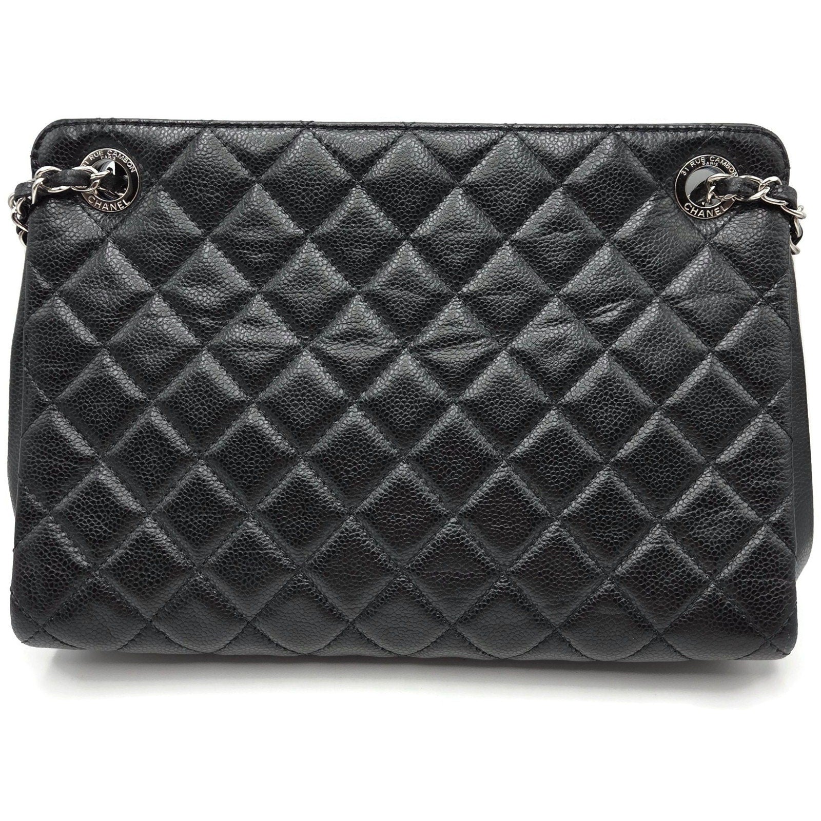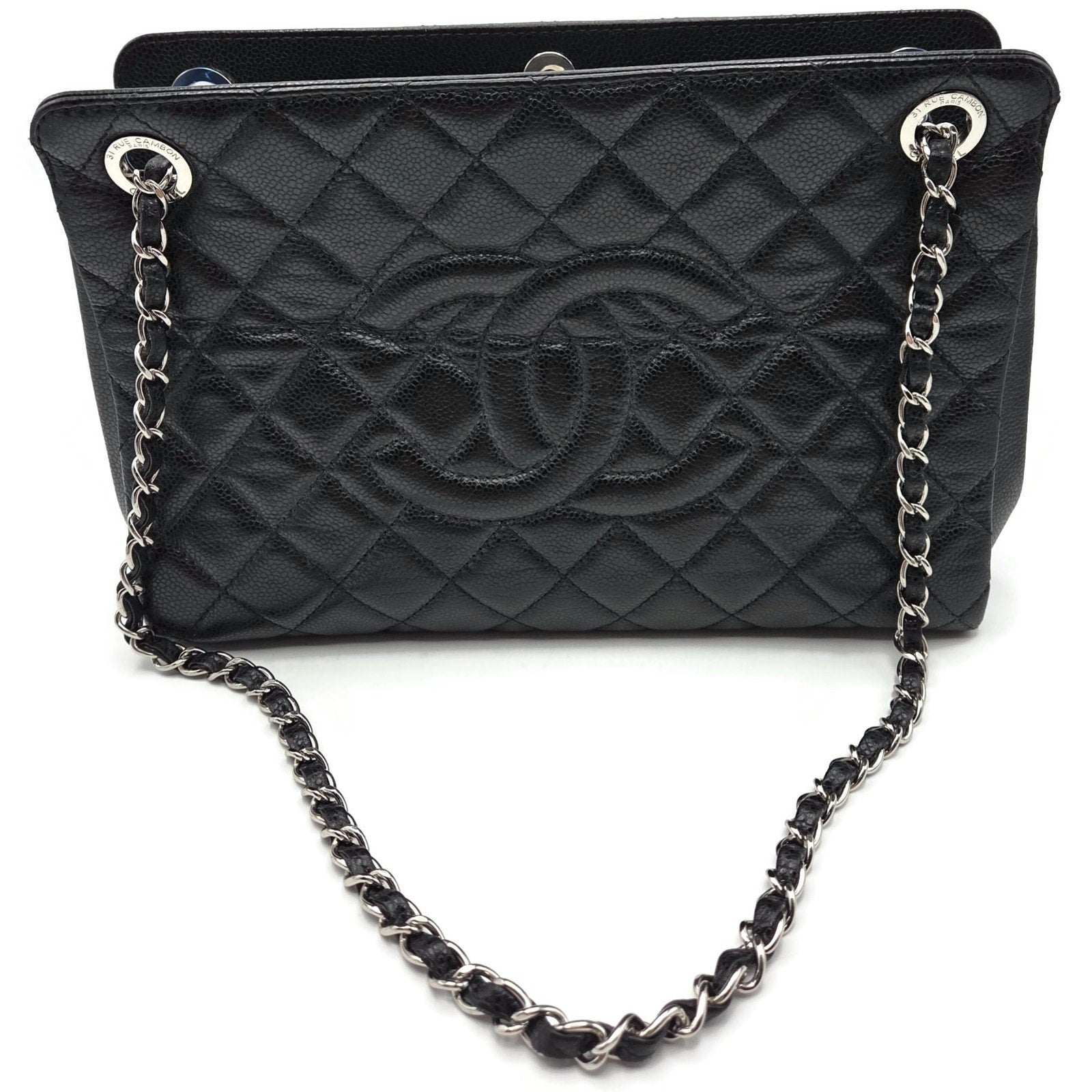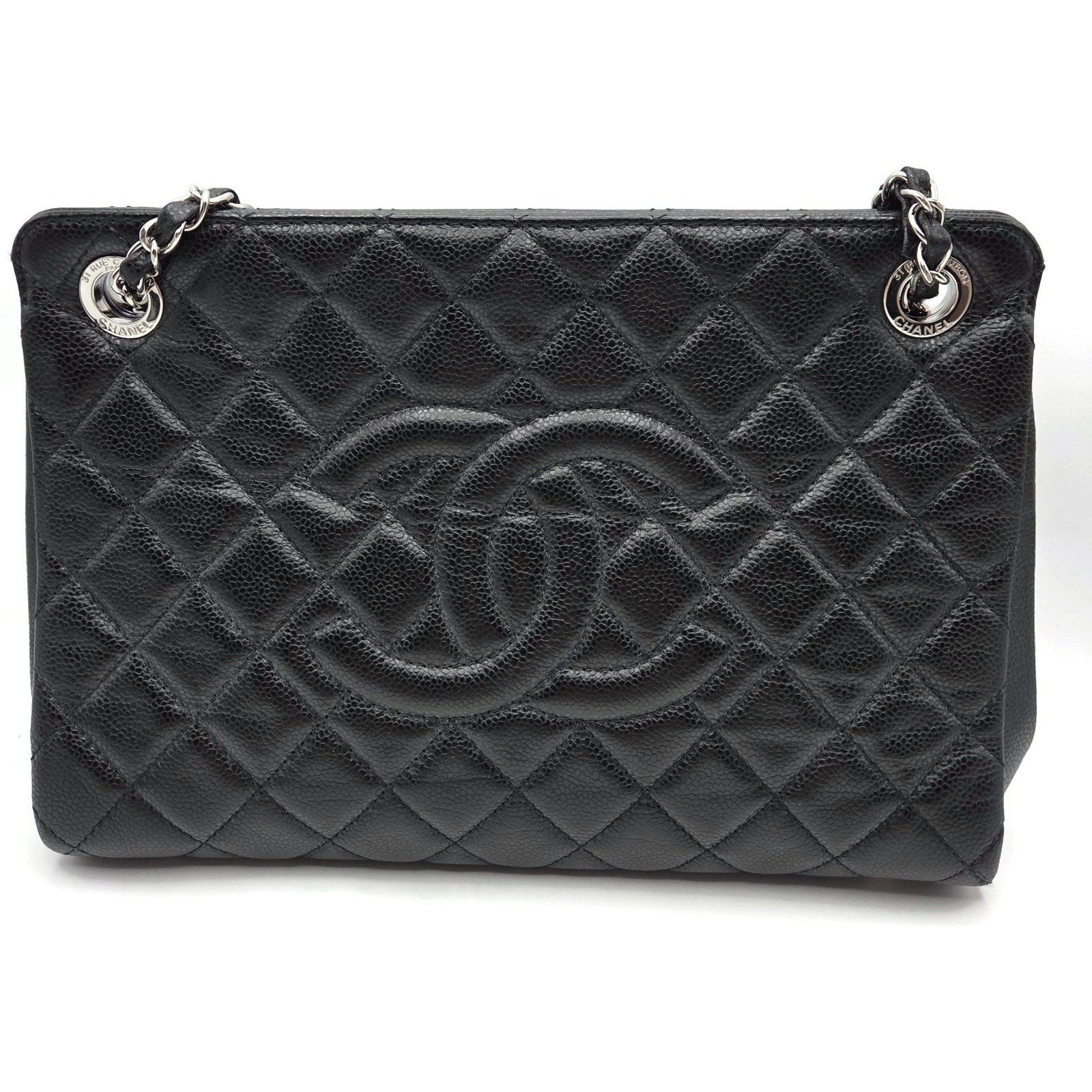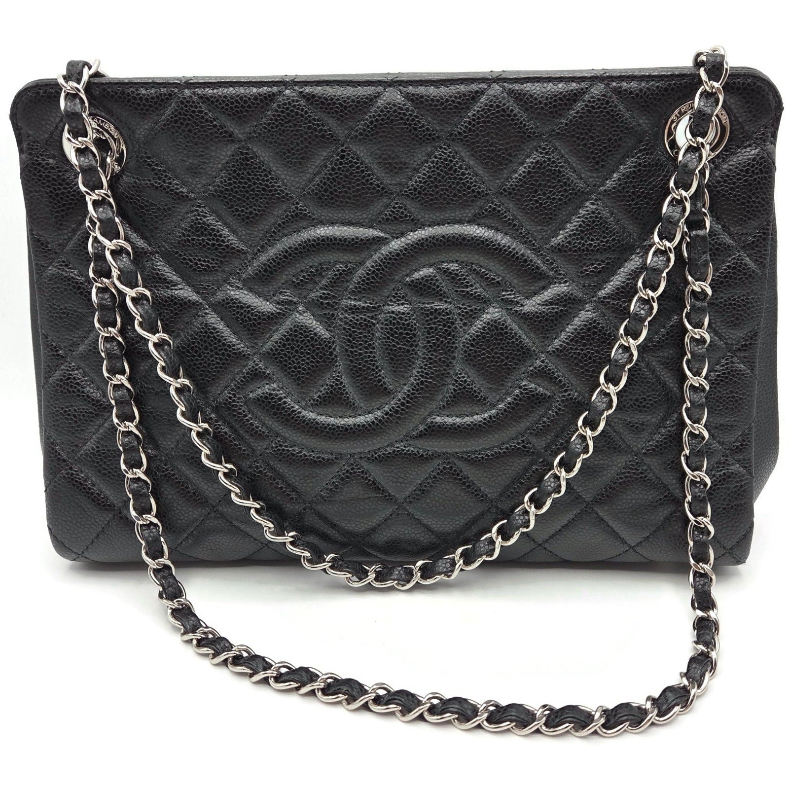 Chanel Grand Shopping Tote (GST) from the Classic Collection is crafted from durable black caviar leather with silver-tone ruthenium-plated hardware. The exterior features Chanel’s signature diamond quilting, stitched interlocking CC logo, and dual leather-woven chain shoulder straps..