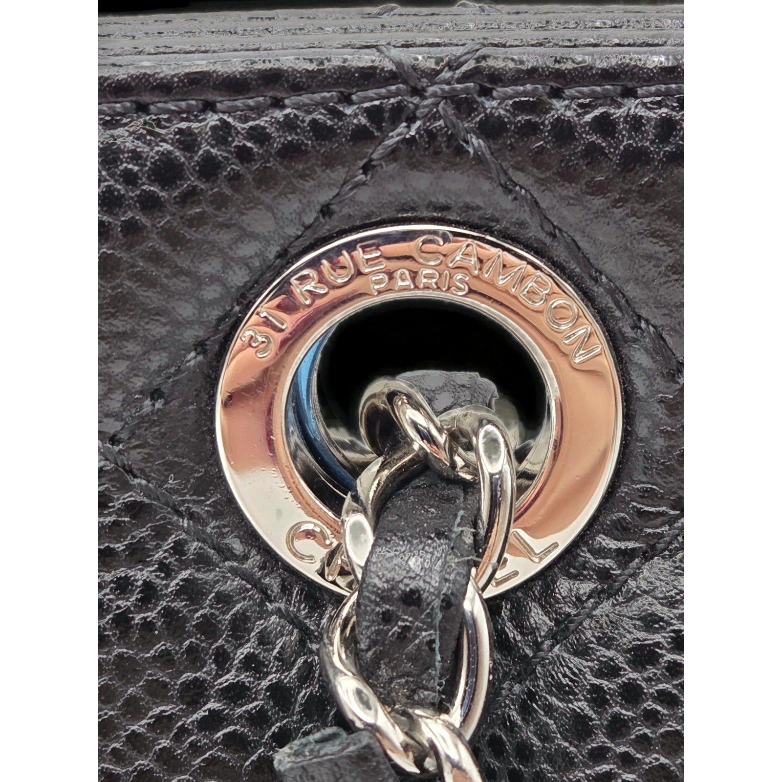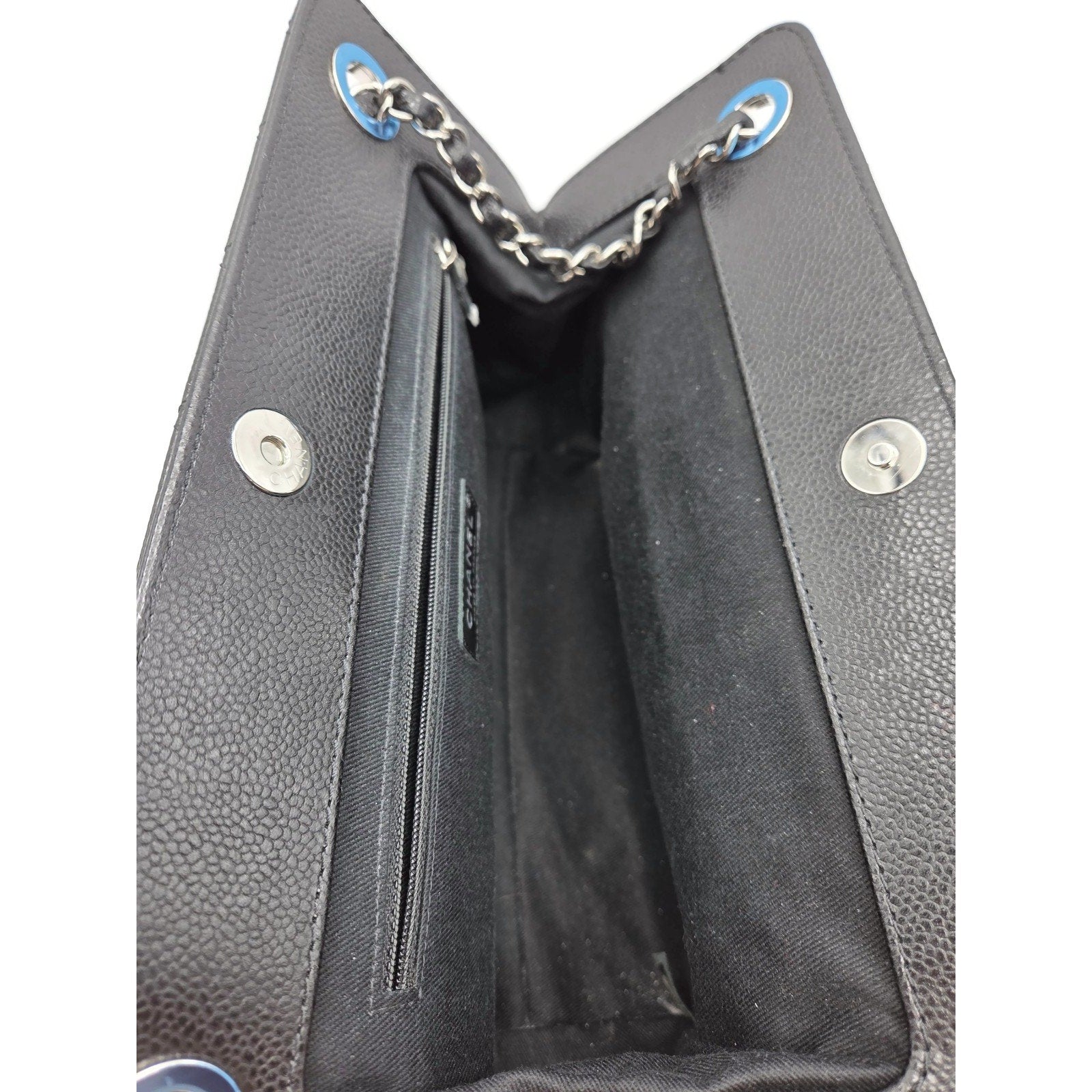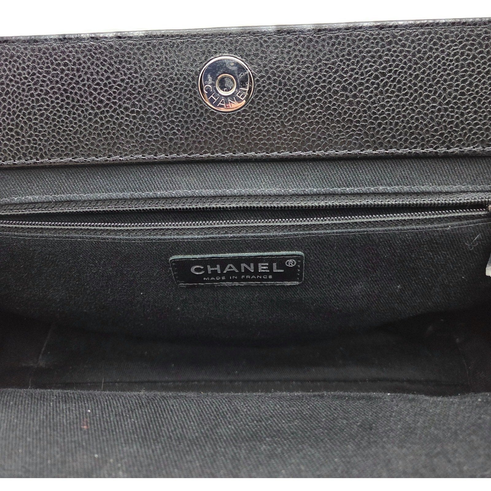 This model A65734 was released as part of Chanel’s 13C (2013 Cruise) Collection and was made in France. The interior is lined in sleek black fabric and features a center zip compartment, open pocket, and zip pocket for organized functionality. The design is completed with a rear slip pocket and protective metal feet at the base.