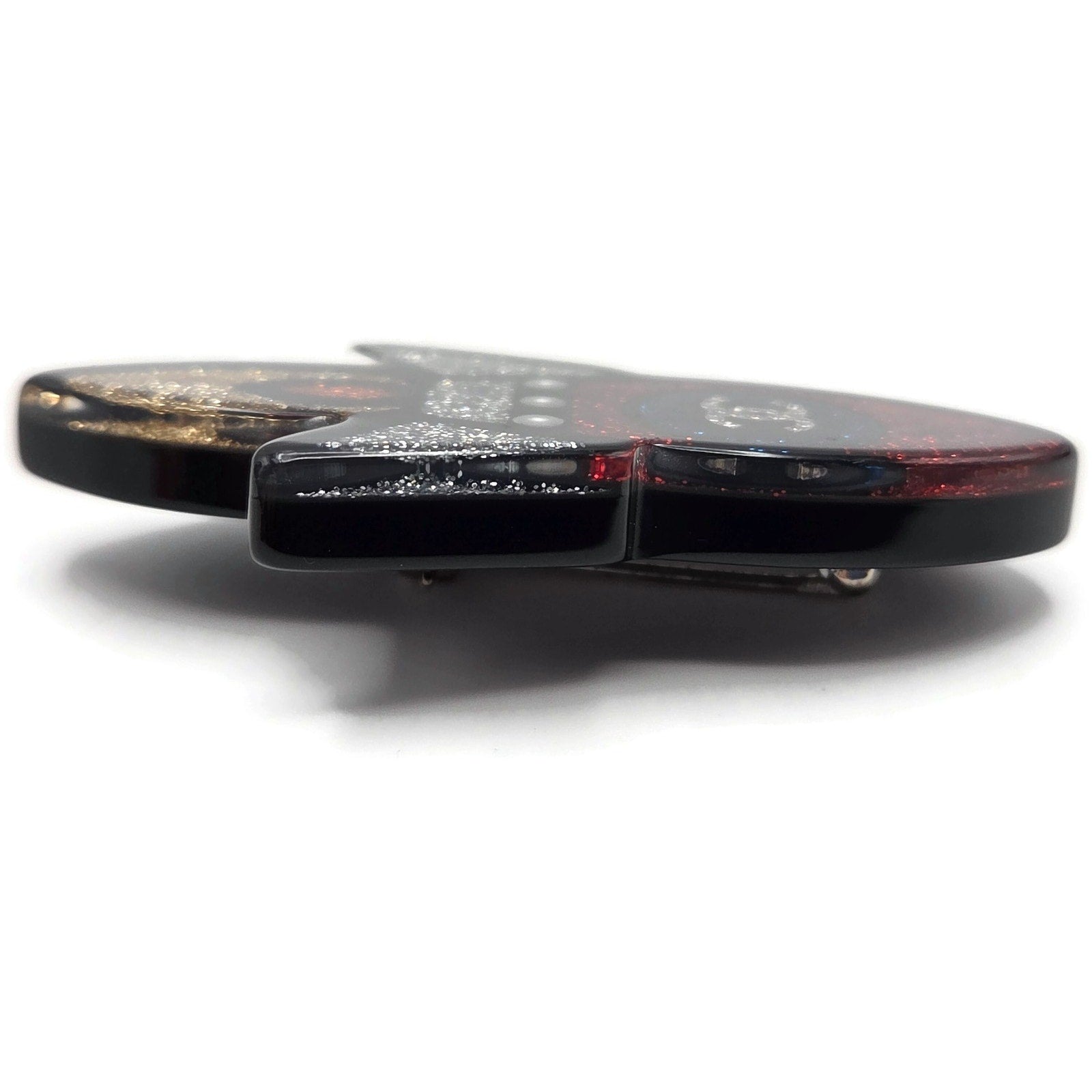 This whimsical space ship design features layered resin in black with red, blue, silver, and gold glitter detailing. The center is adorned with a rhinestone CC logo set within a blue halo. Three faux pearl accents add dimension to the body, with a gold glitter flame detail at the base.