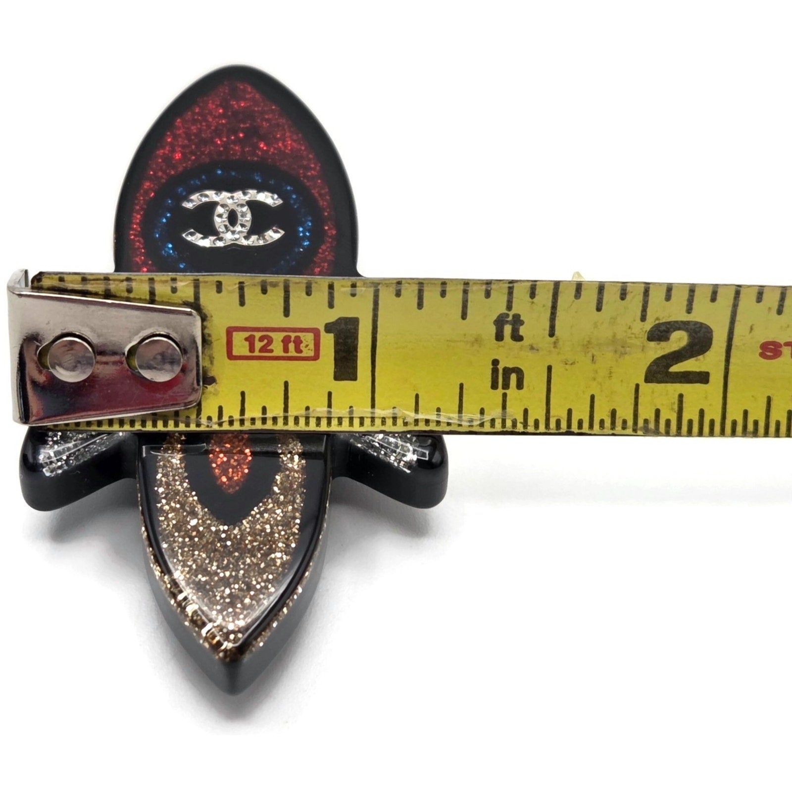 The brooch measures approximately 3 inches in length and weighs 9.26 grams, giving it a substantial yet wearable feel. The back is stamped CHANEL 17S CC Made in France with gold tone hardware and a secure rotating clasp.