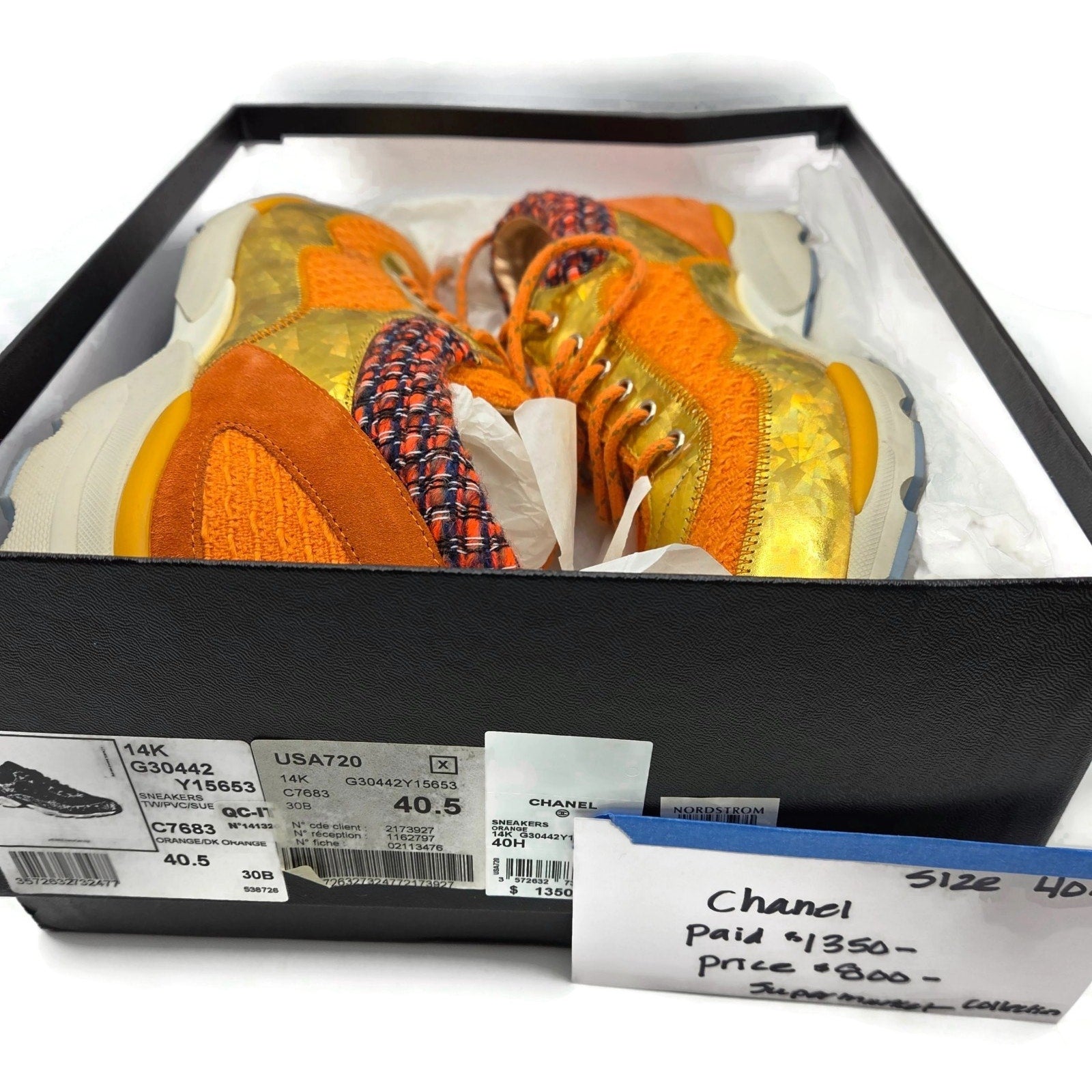 Chanel Sneakers Orange 14k Gold Supermarket Tweed PVC Suede Women EU Size 40.5