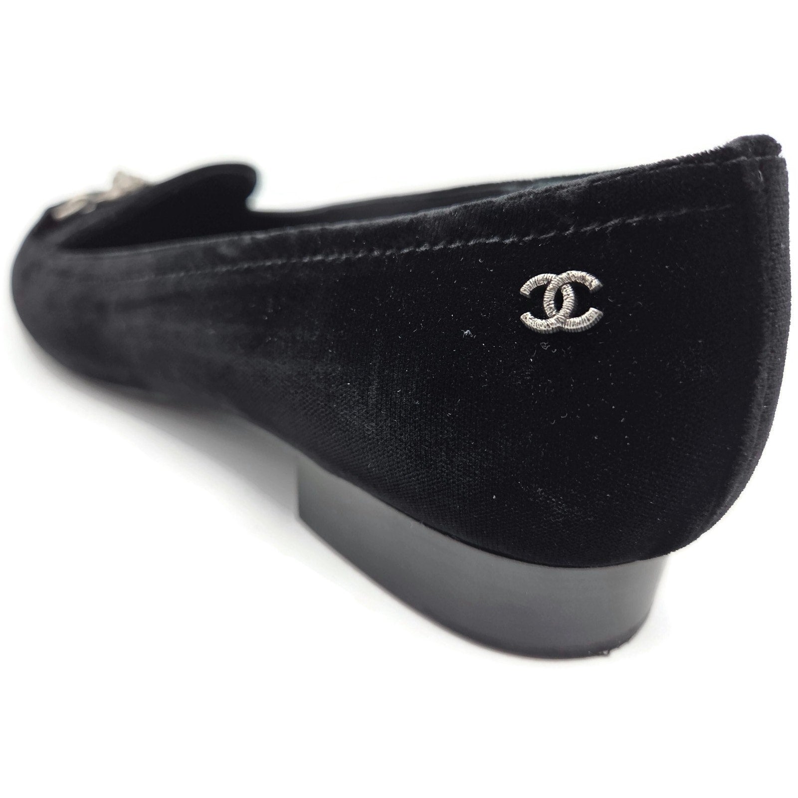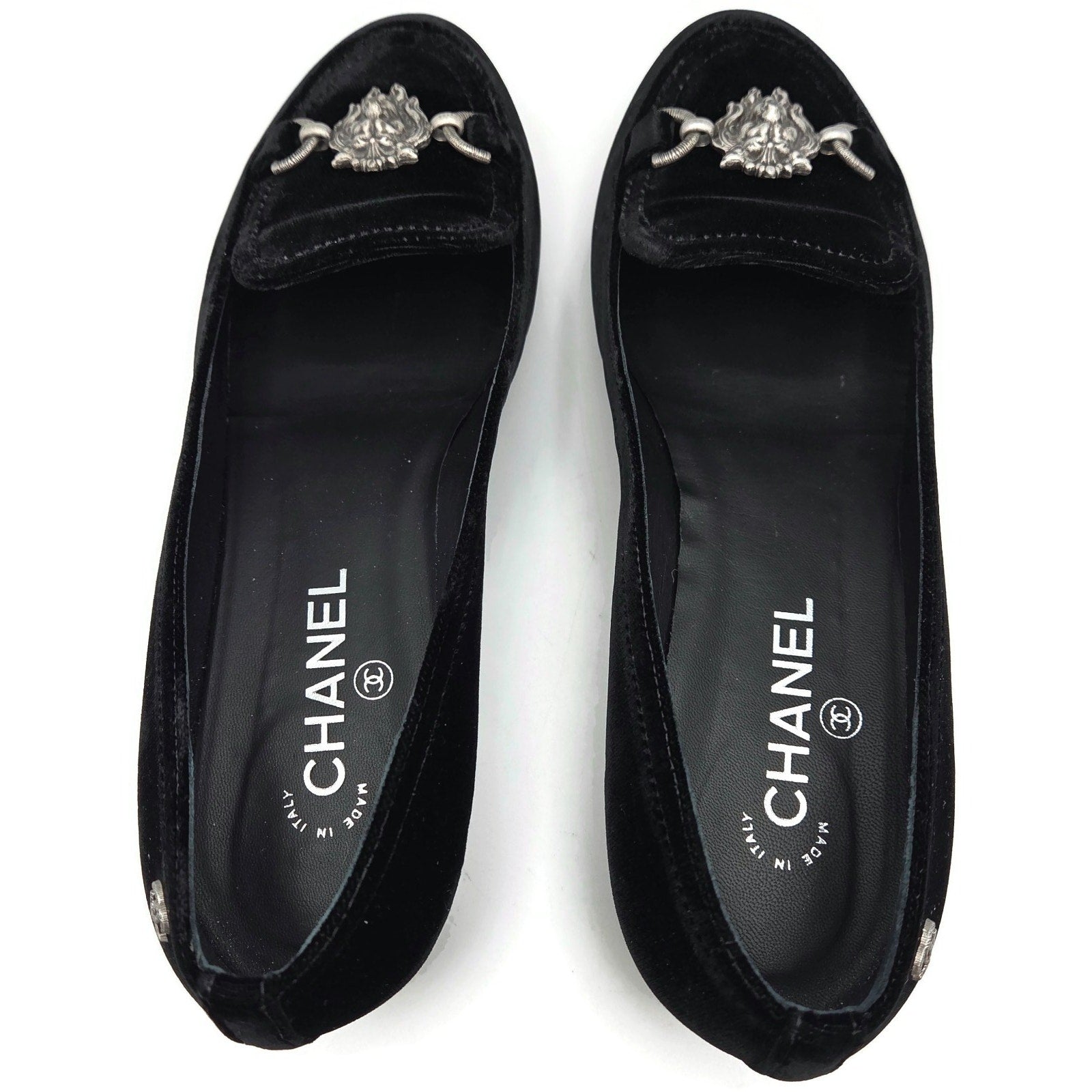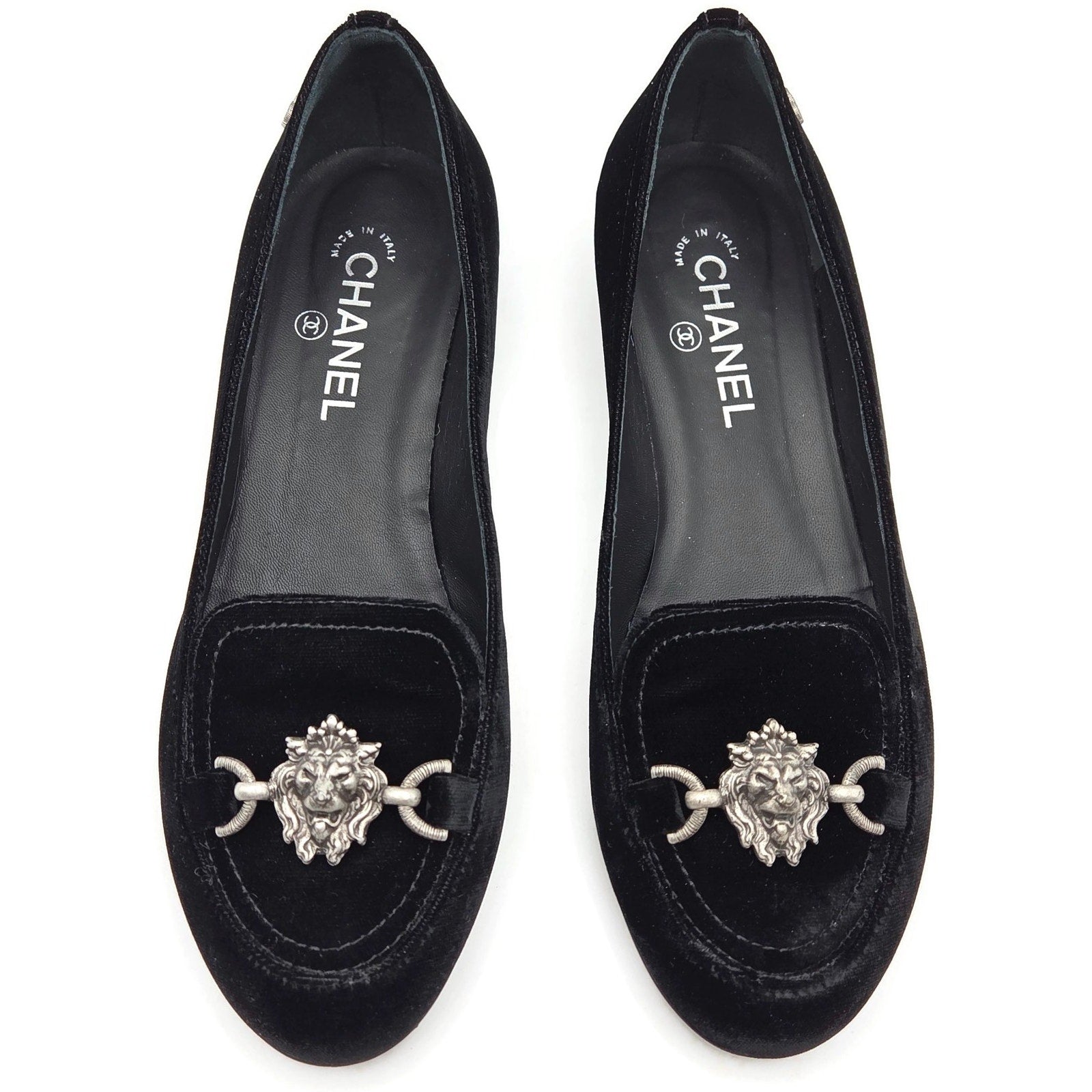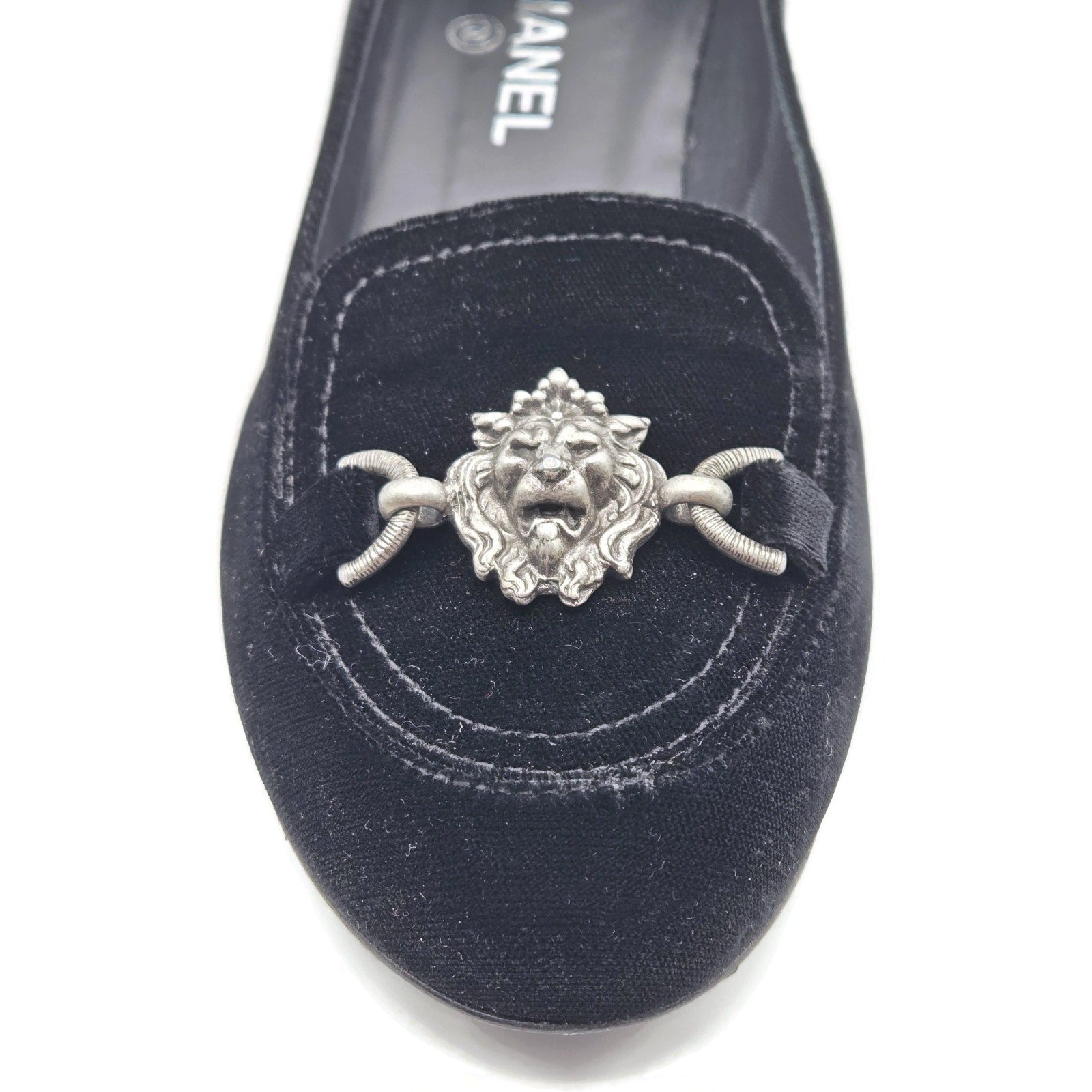 Chanel Velvet Lion Loafers Black 40 w/ Box & 2 Dust Bags (1 per shoe). Authentic Chanel velvet loafers featuring an elegant silver lion head hardware accent, iconic CC logo at the heel, and a timeless black velvet finish. A rare and luxurious design, perfect for collectors or anyone seeking a refined everyday statement shoe.
