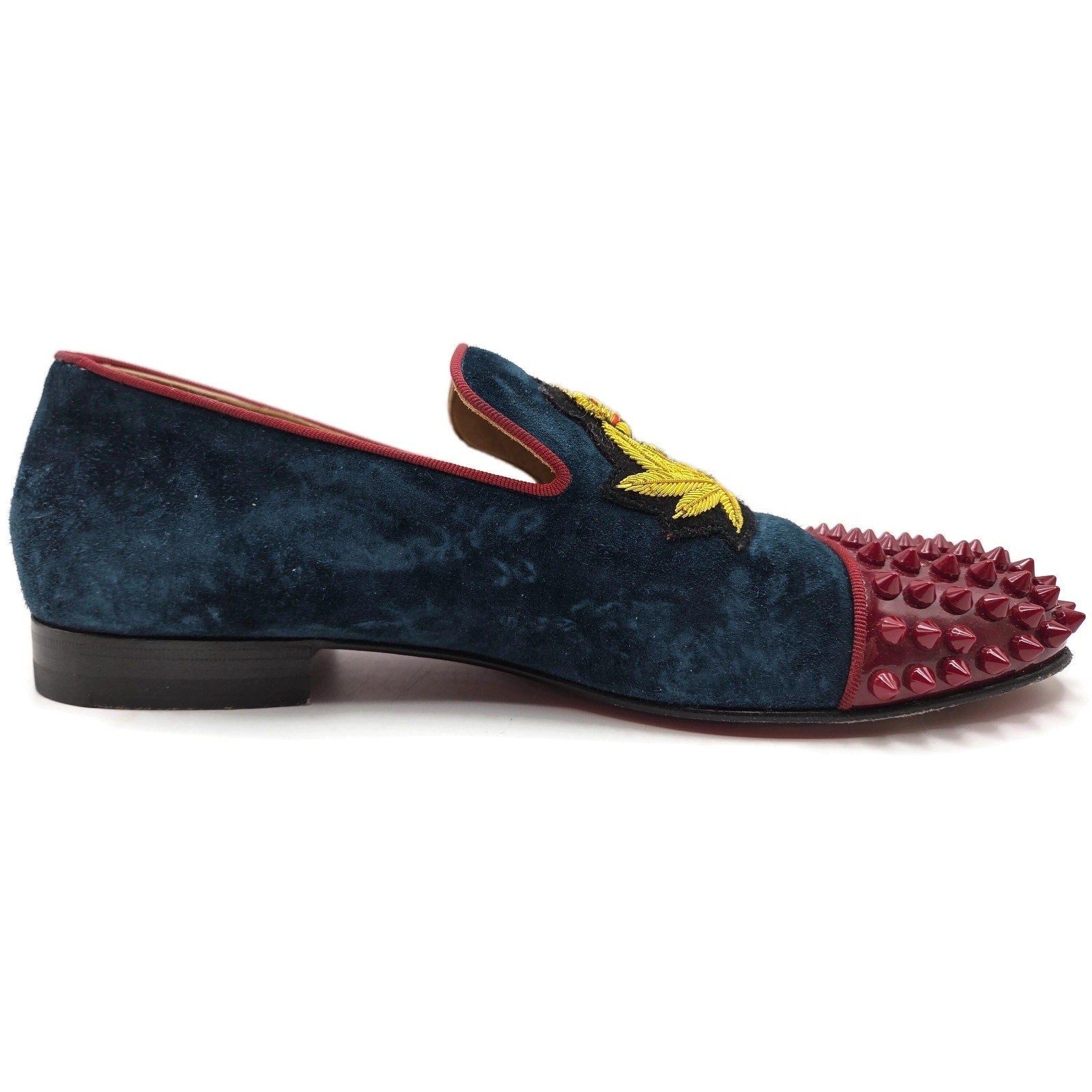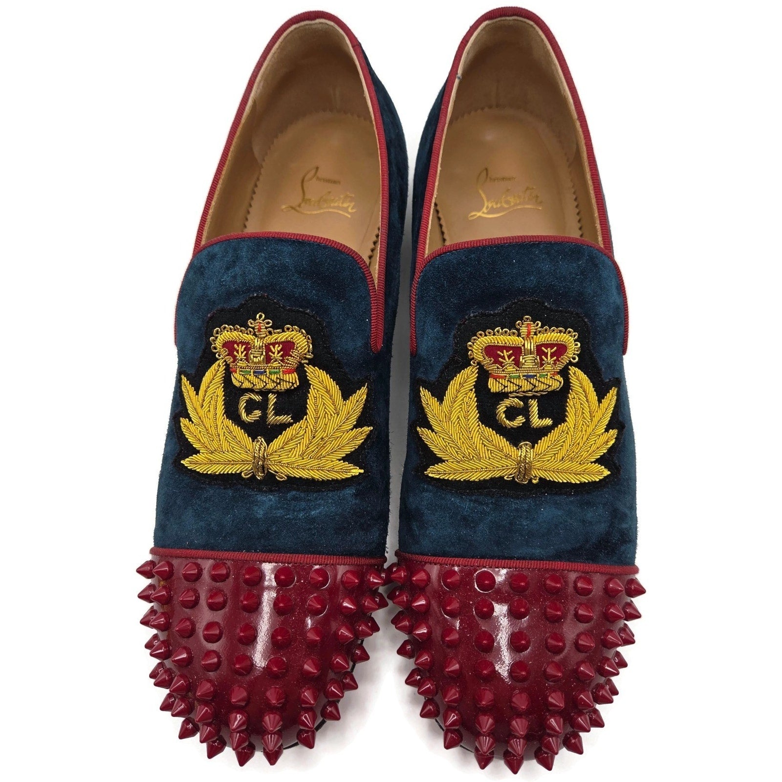 Christian Louboutin Harvanana flats in veau velours (suede). This rare style features deep blue suede uppers, bold red spiked toe caps, and an ornate embroidered crest detail in gold and red.