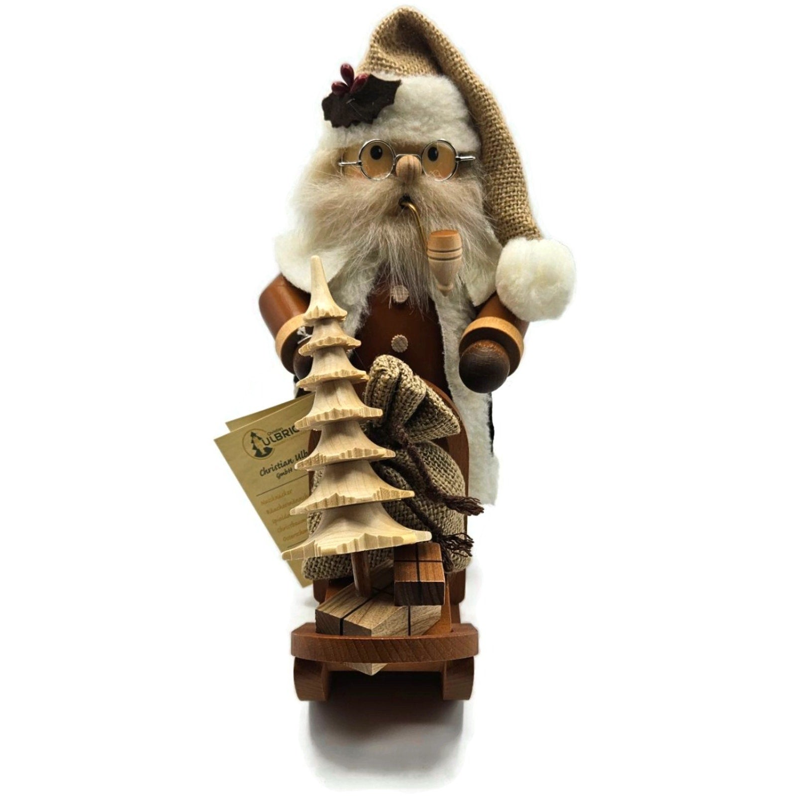 This charming wooden figurine features Santa in a cozy natural-toned outfit, complete with a burlap hat, faux fur trim, pipe, and a sled filled with a tree, gifts, and a burlap sack. Each detail is carefully hand-finished, embodying the quality and warmth for which Ulbricht is renowned.