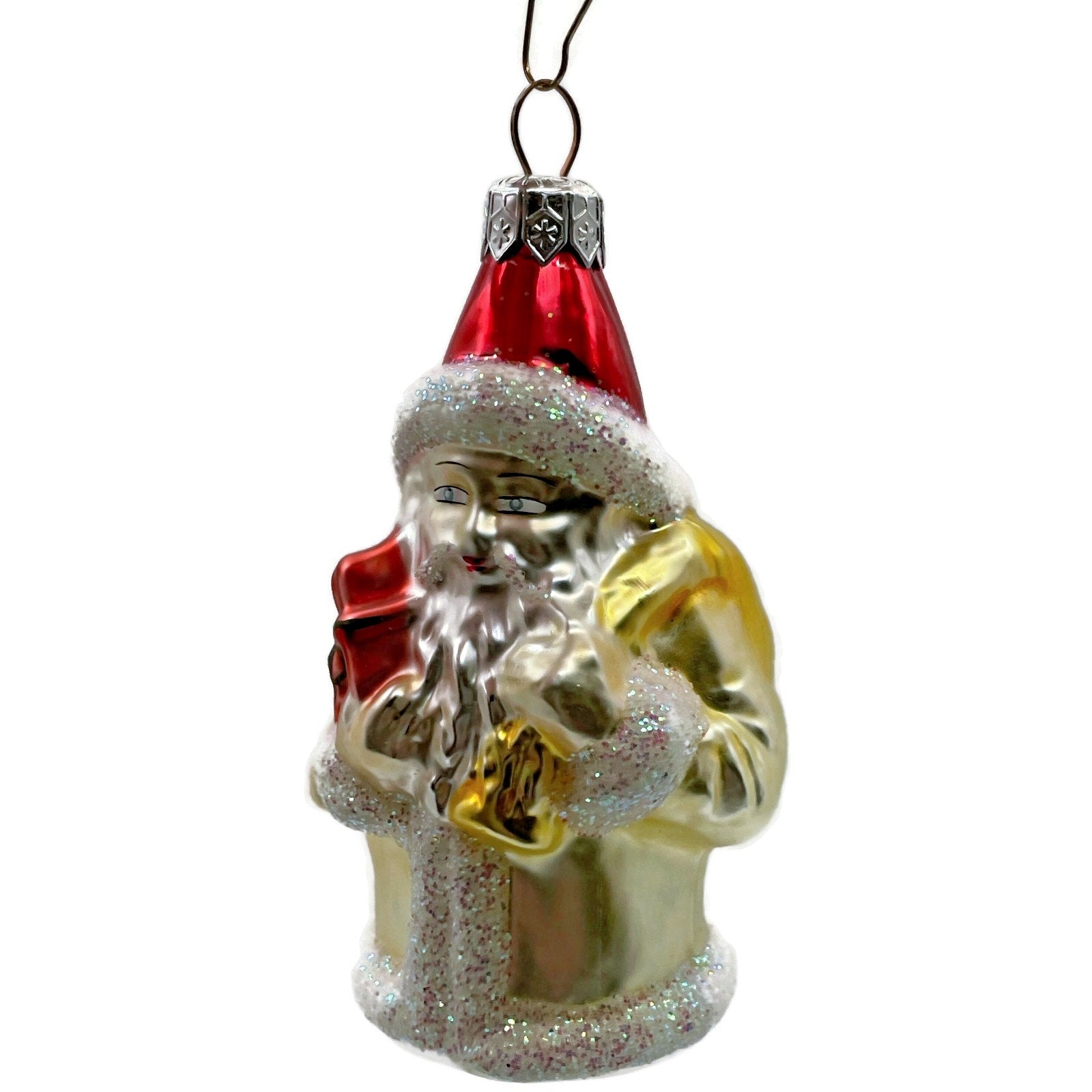 Christopher Radko Ornament Santa Claus In Yellow Gift Bag Christmas Tree Decoration
