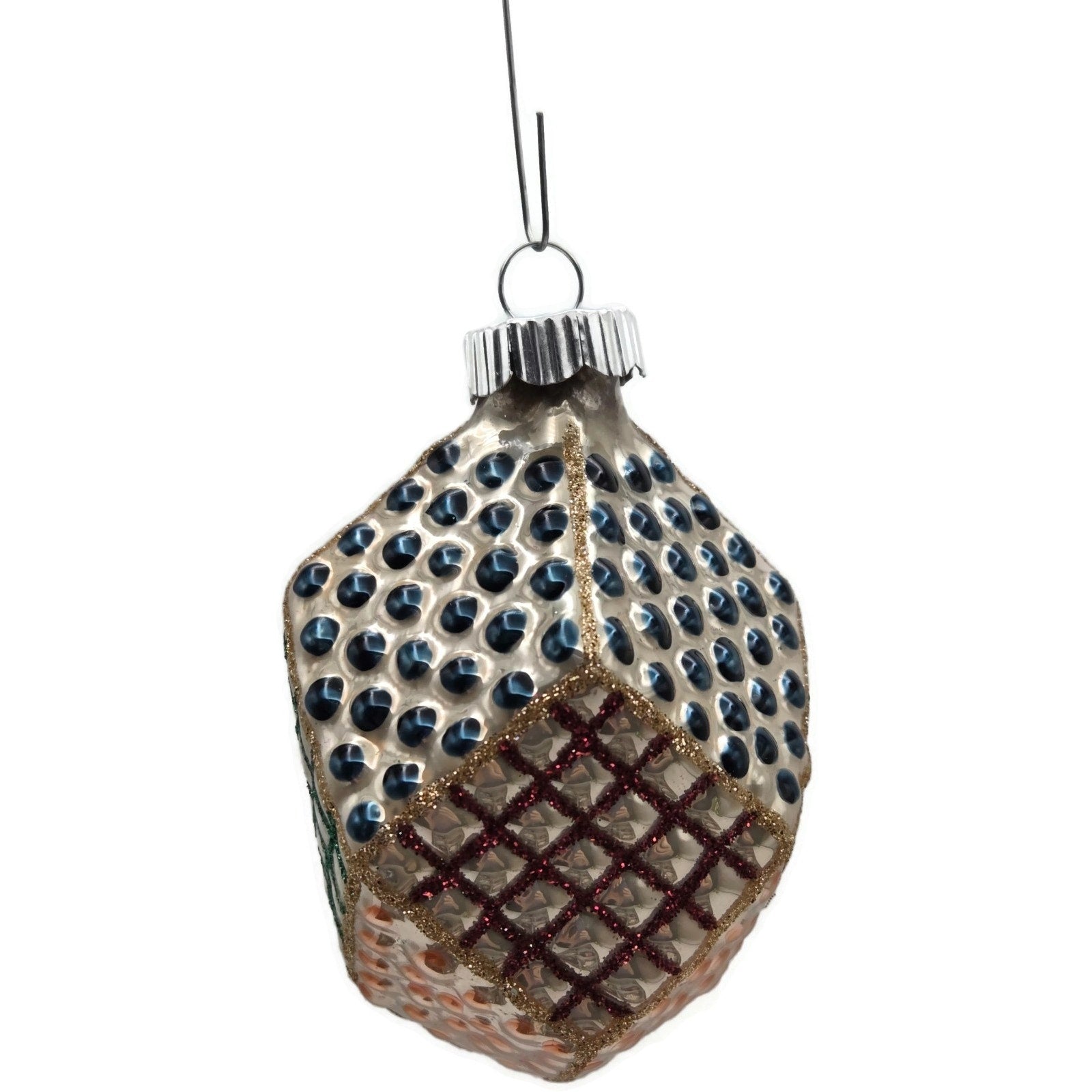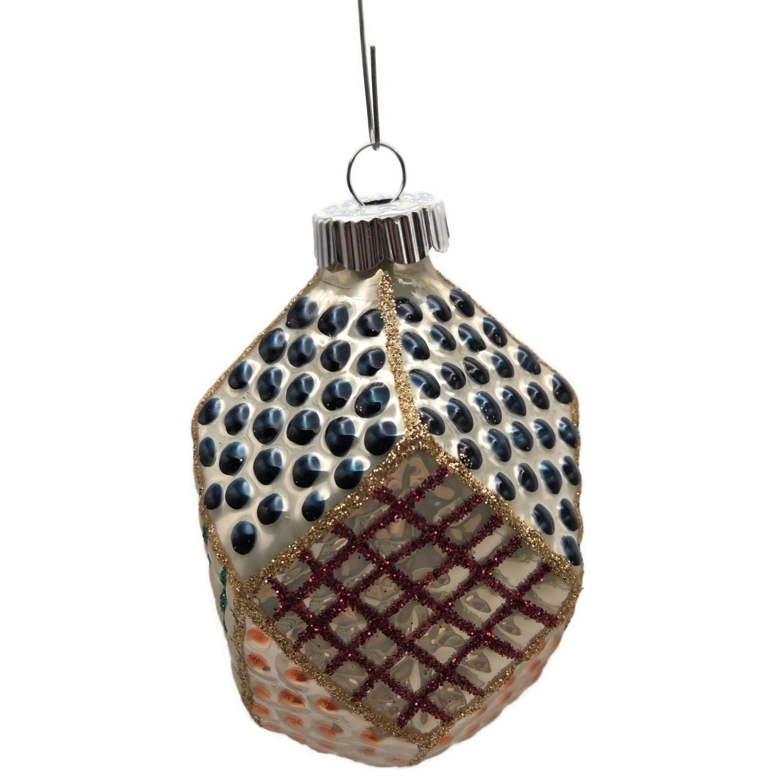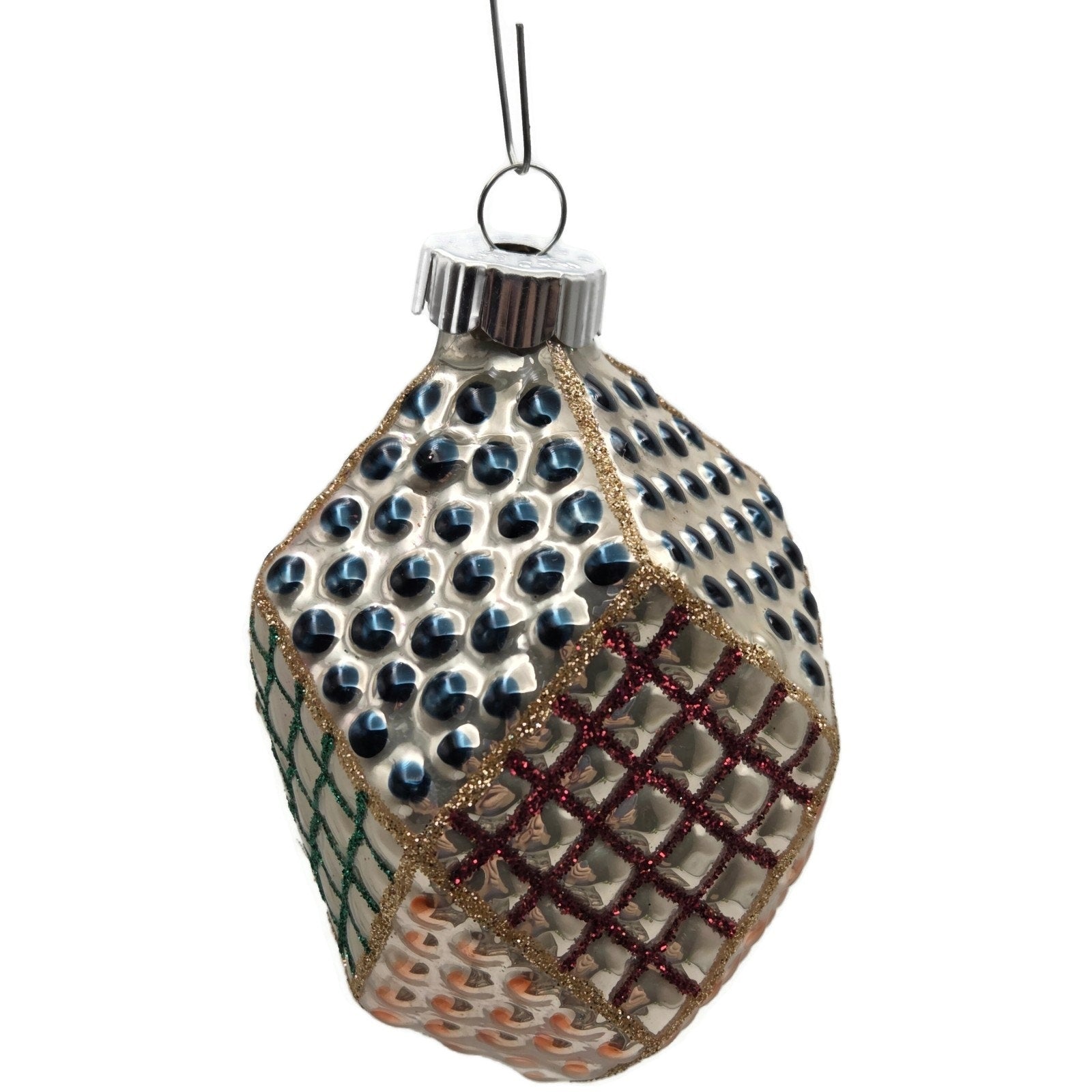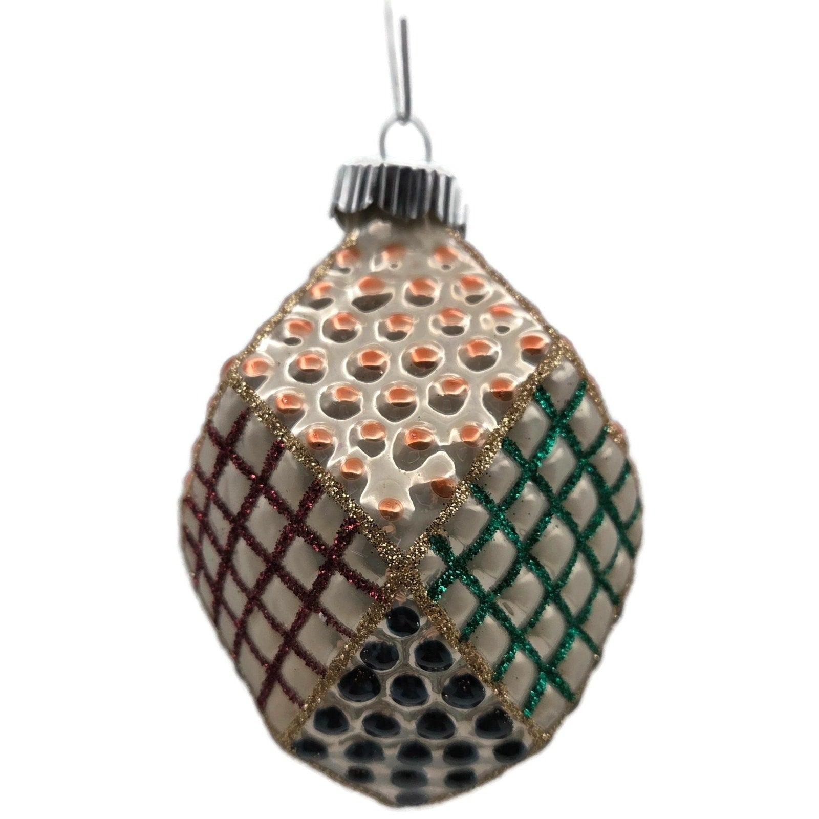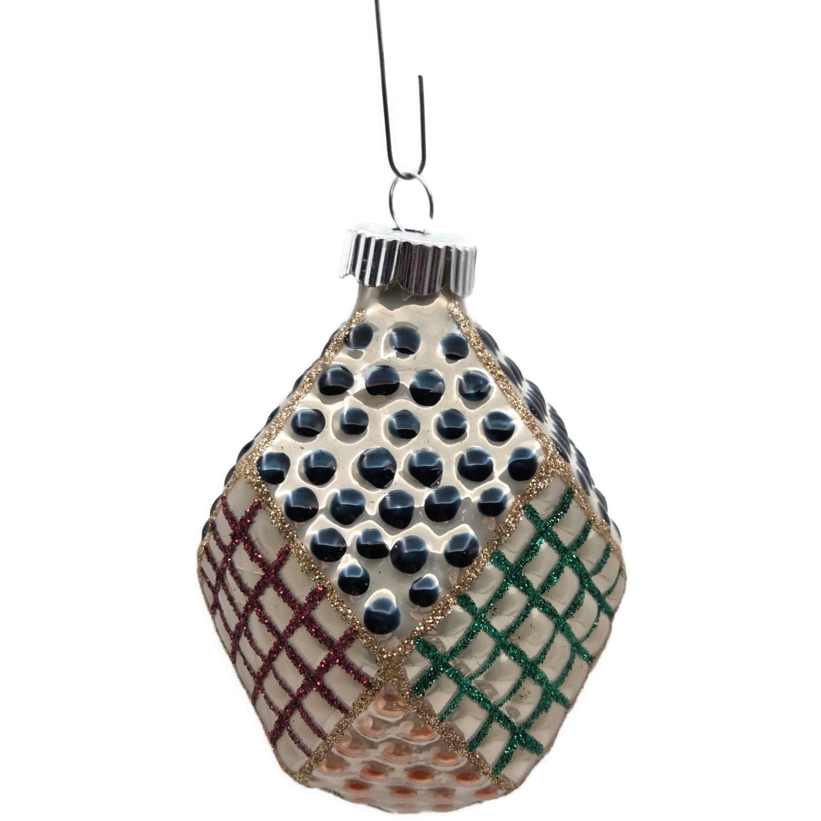 Shapes include four diamond “patchwork” bulbs with raised dot and glitter lattice panels and two teardrop bulbs with silver starburst appliqué—each about 4" tall × 2.5" wide.
