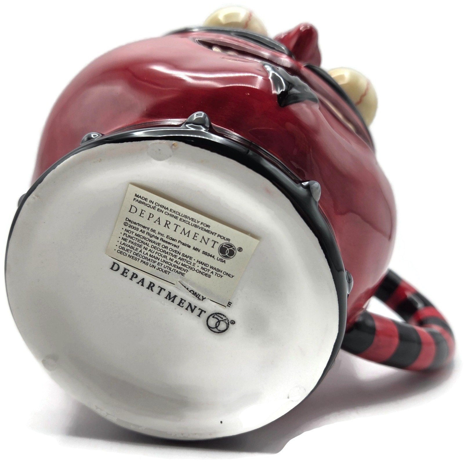 Rare and retired Department 56 Halloween “Googly Eye Devil” sculpted ceramic mug. Features bulging 3D eyeballs, striped red/black tail handle, pointy horns, and a wicked grin—perfect for spooky displays or a standout shelf piece.