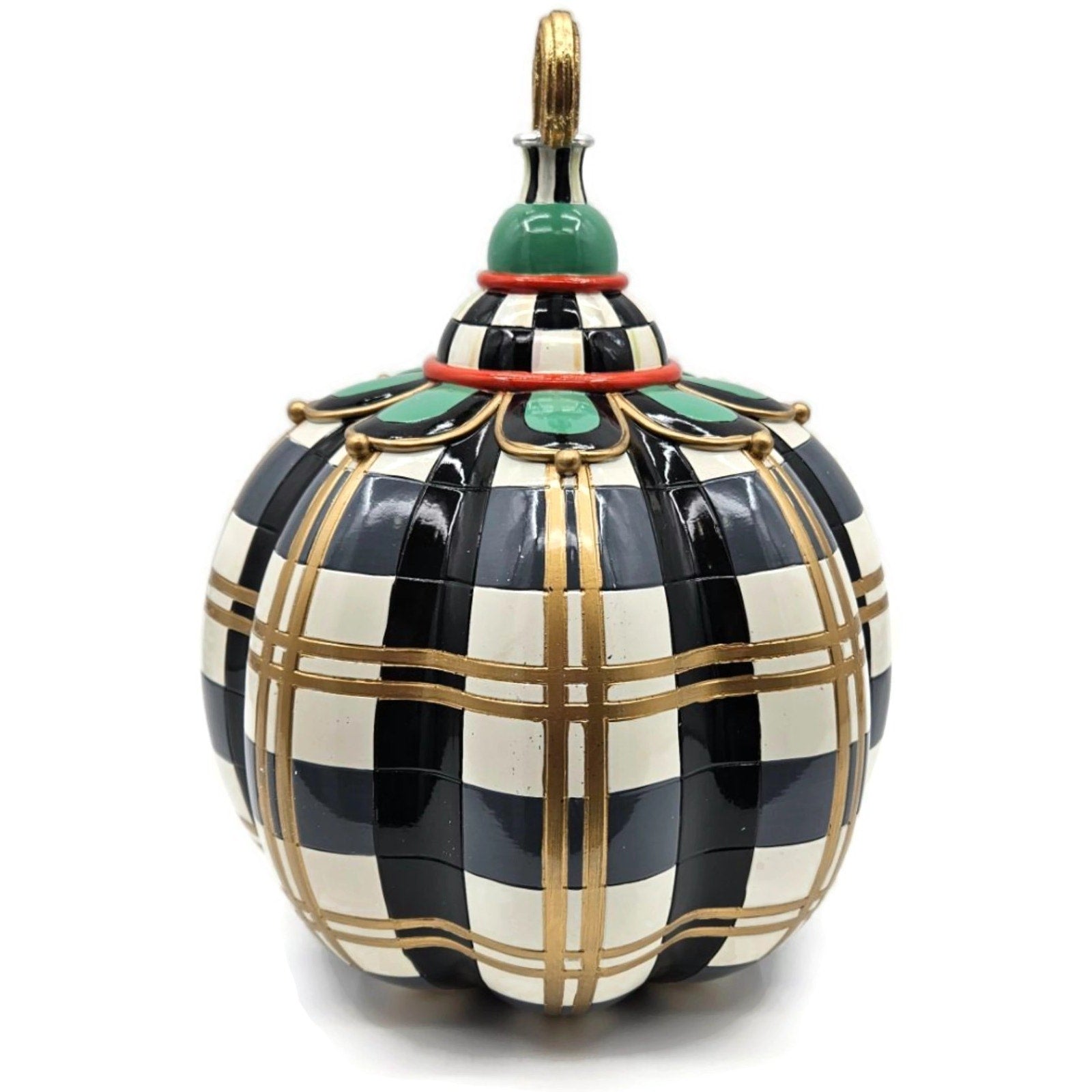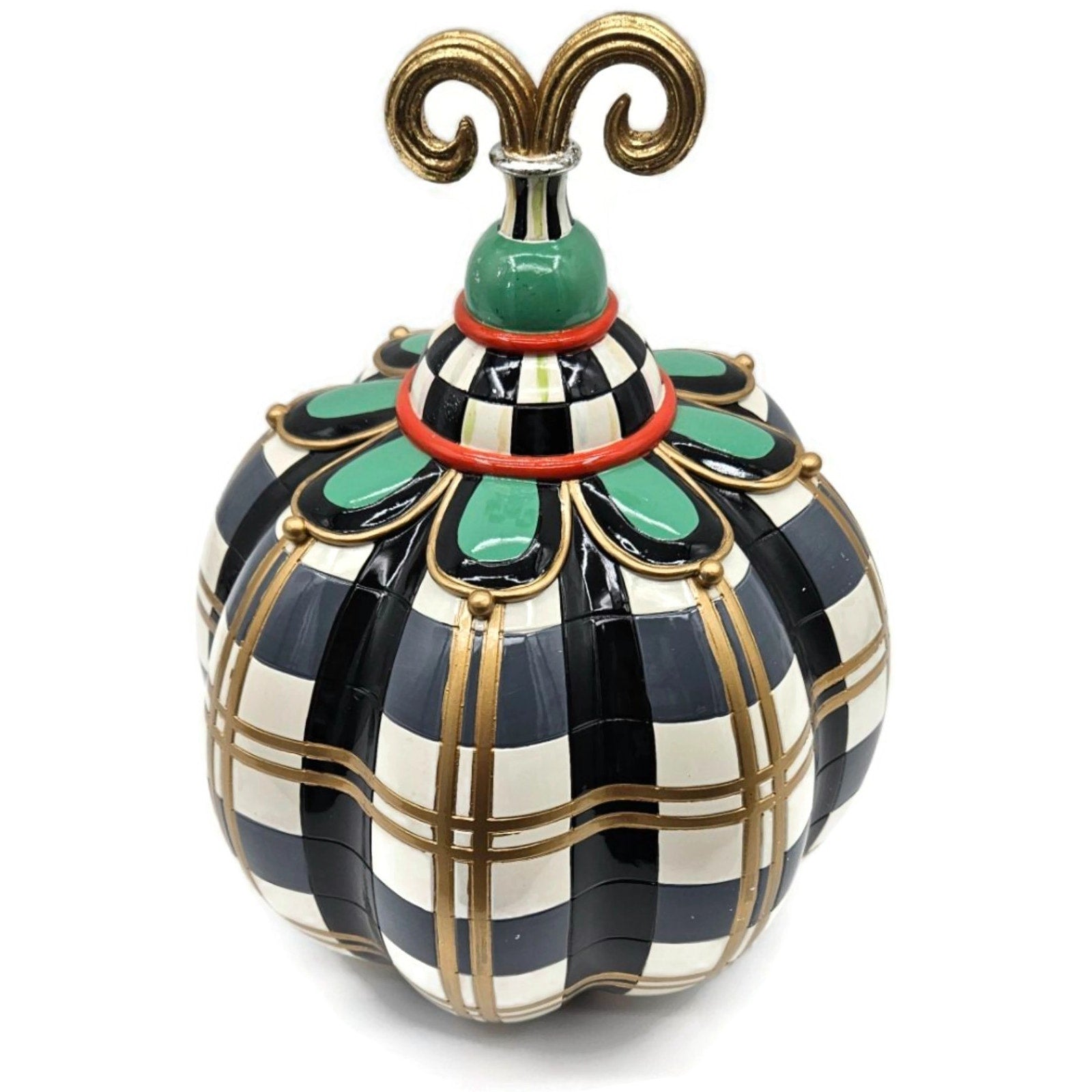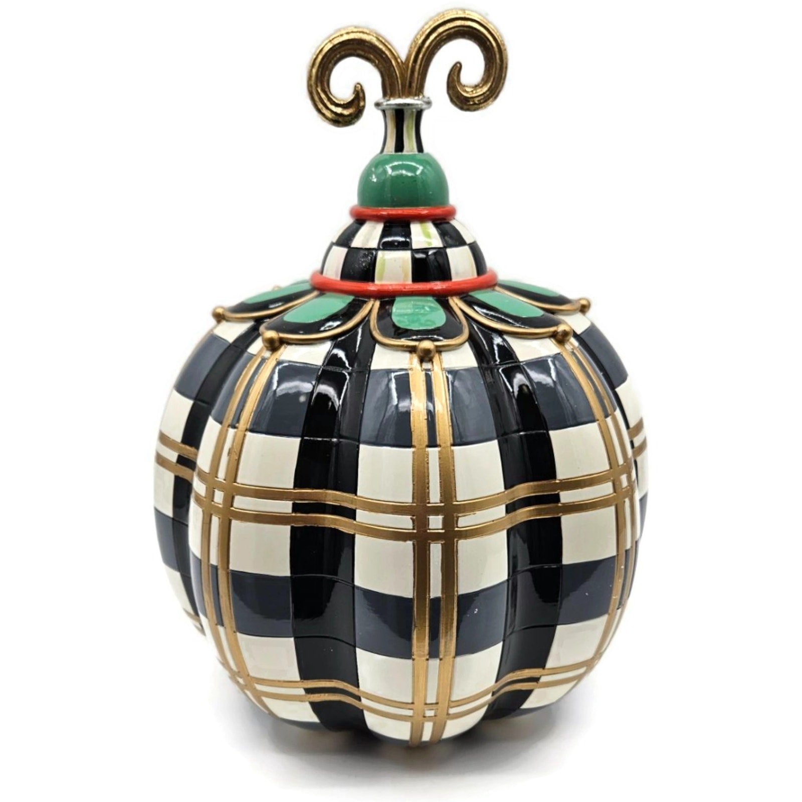 Hand painted MacKenzie-Childs Courtly Check pumpkin with gold striping, scalloped green collar, and curled finial. Classic black-and-ivory checks with red accent ring. Brass MacKenzie-Childs plaque and felt pads on the base (see photos).