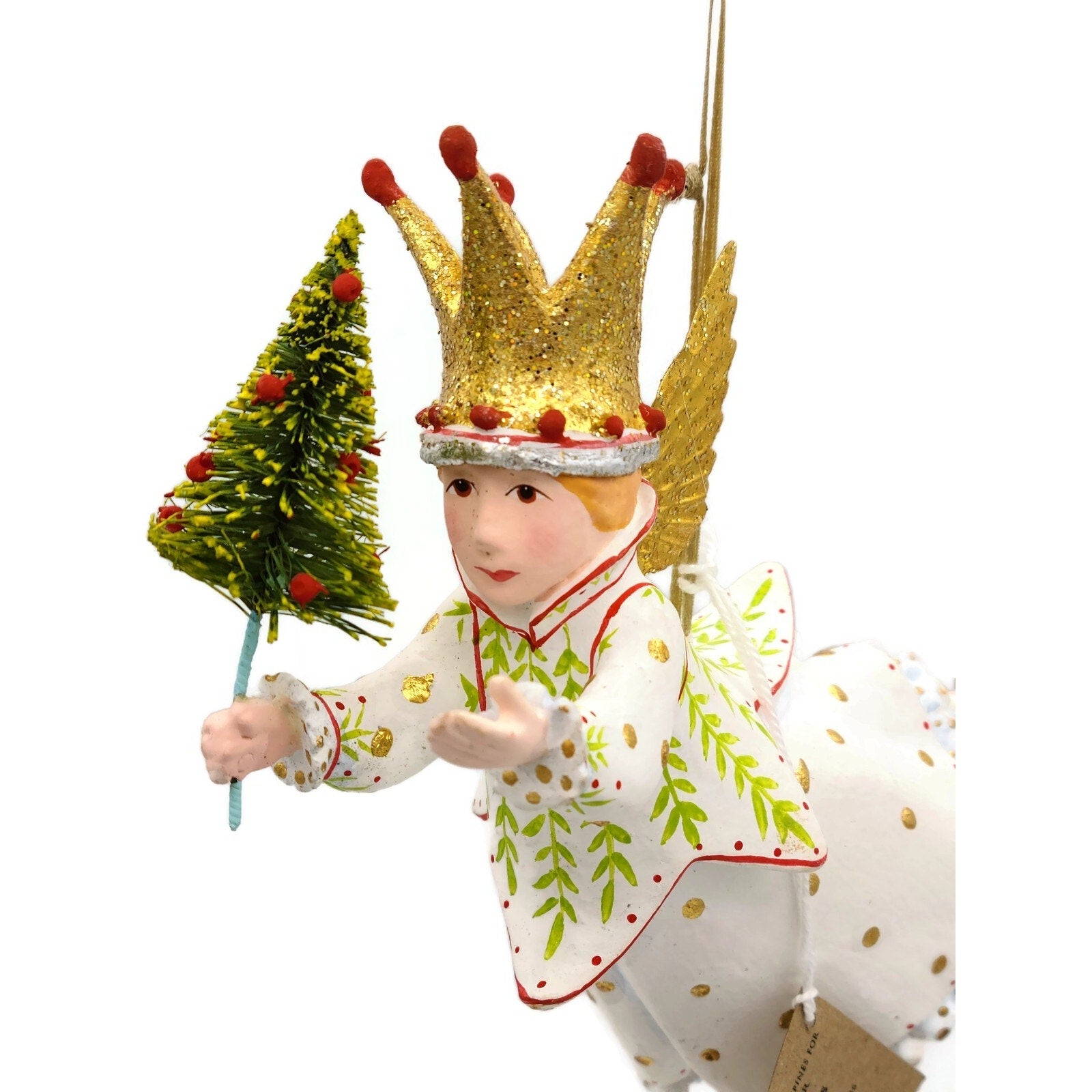 This angel is filled with sparkling Christmas cheer, wearing a gold-leafed crown and carrying a bottle brush tree.