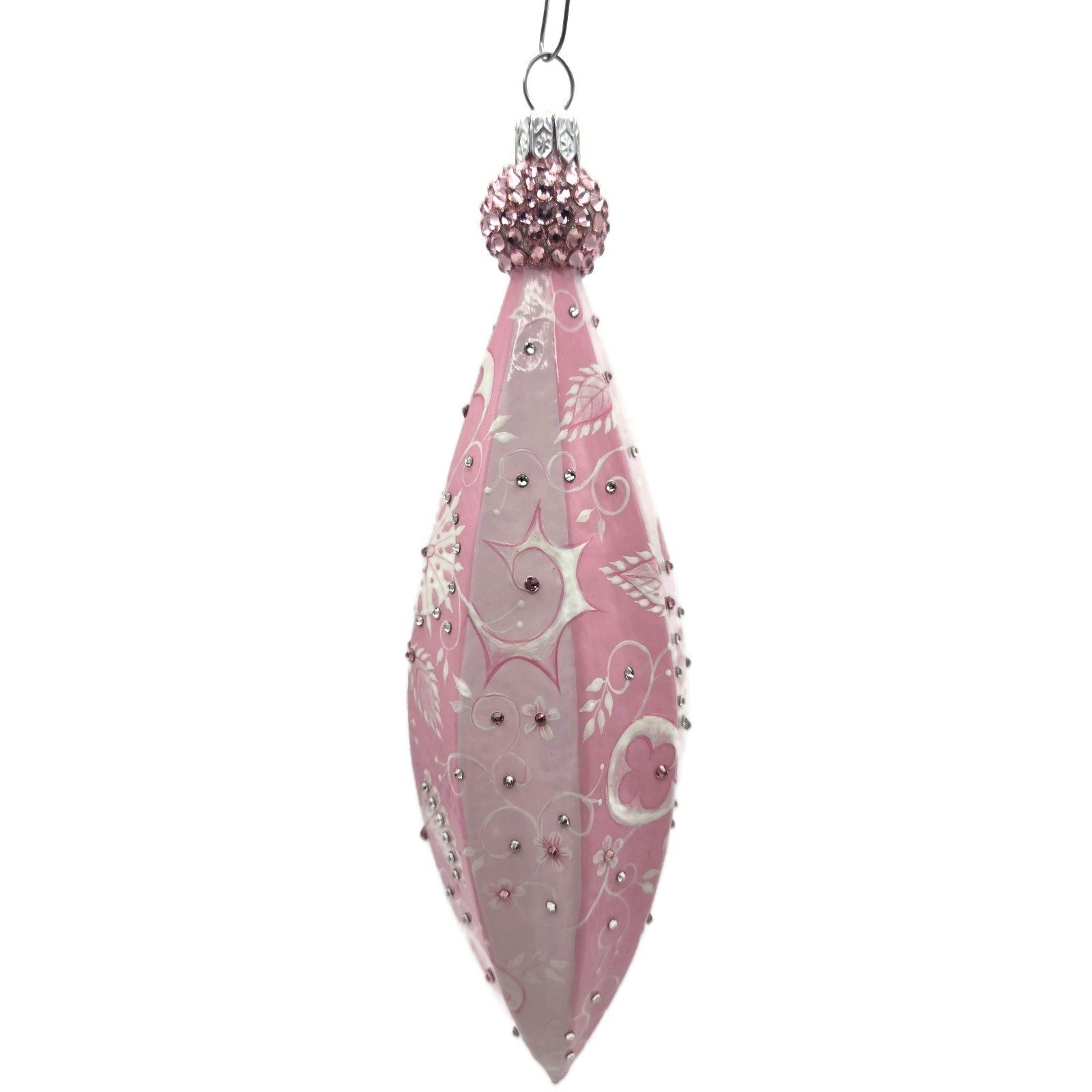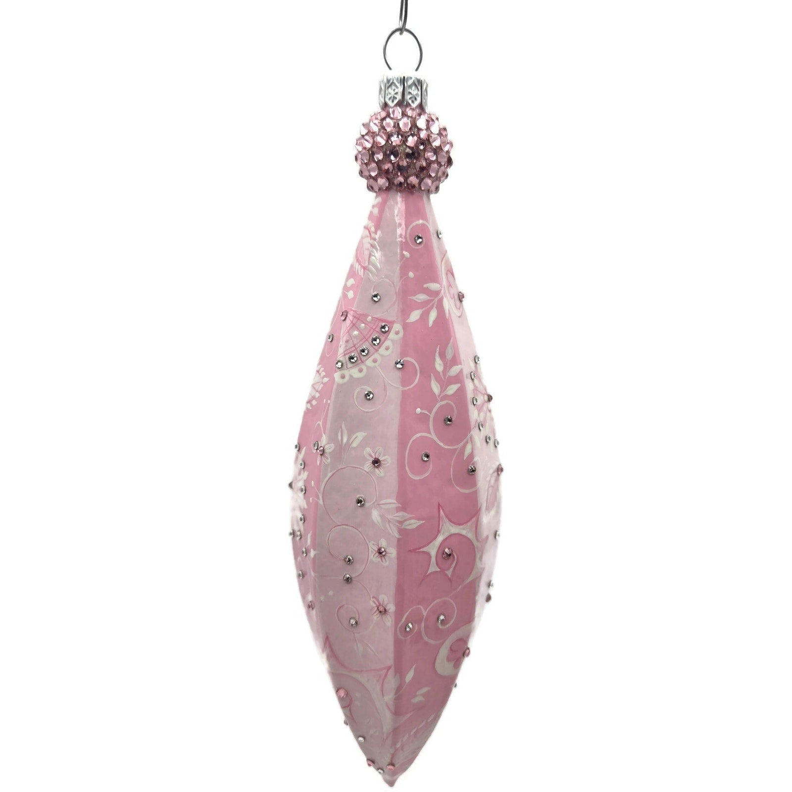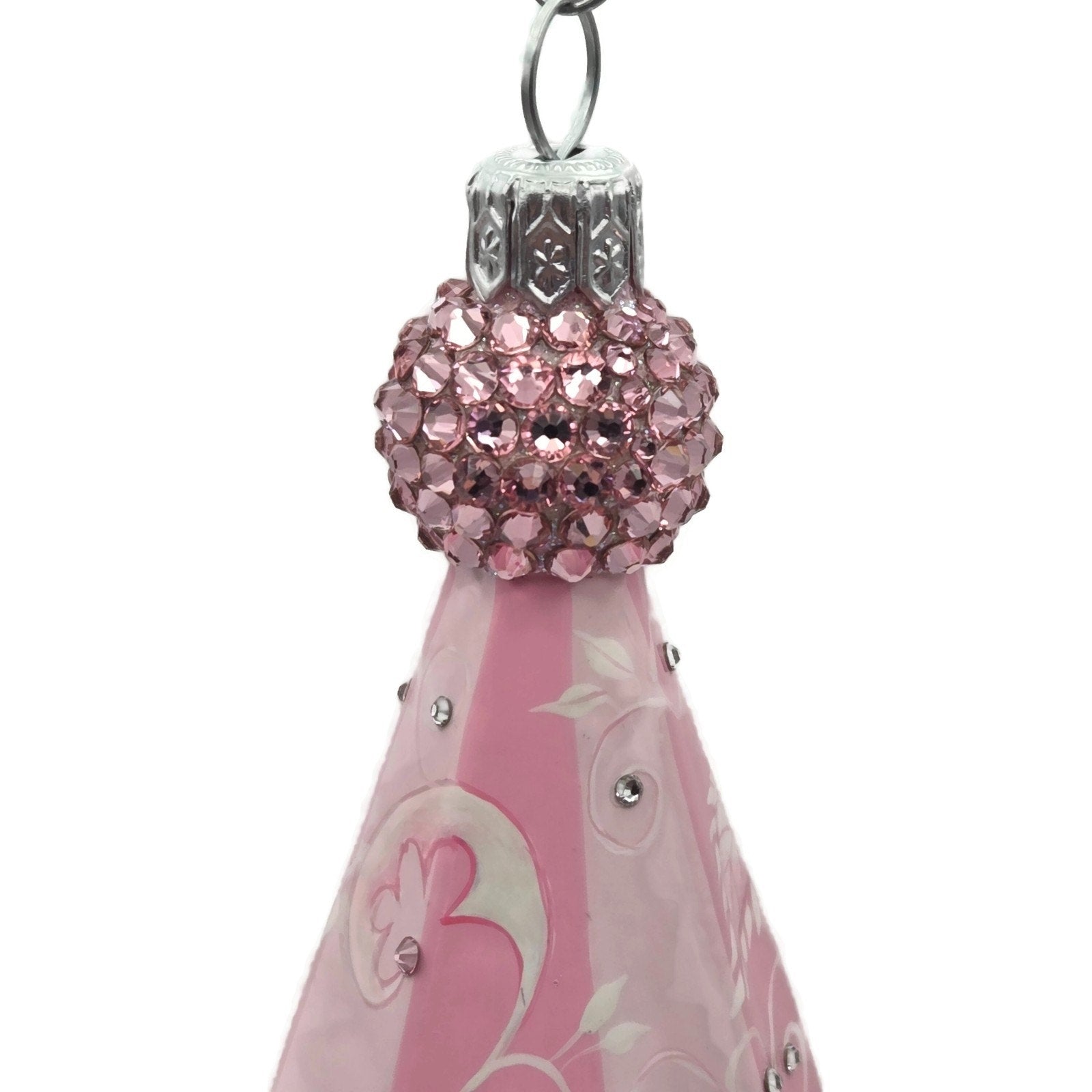 The soft pink palette, crystal accents, and intricate hand-painted details exemplify the quality and craftsmanship of Patricia Breen’s designs..