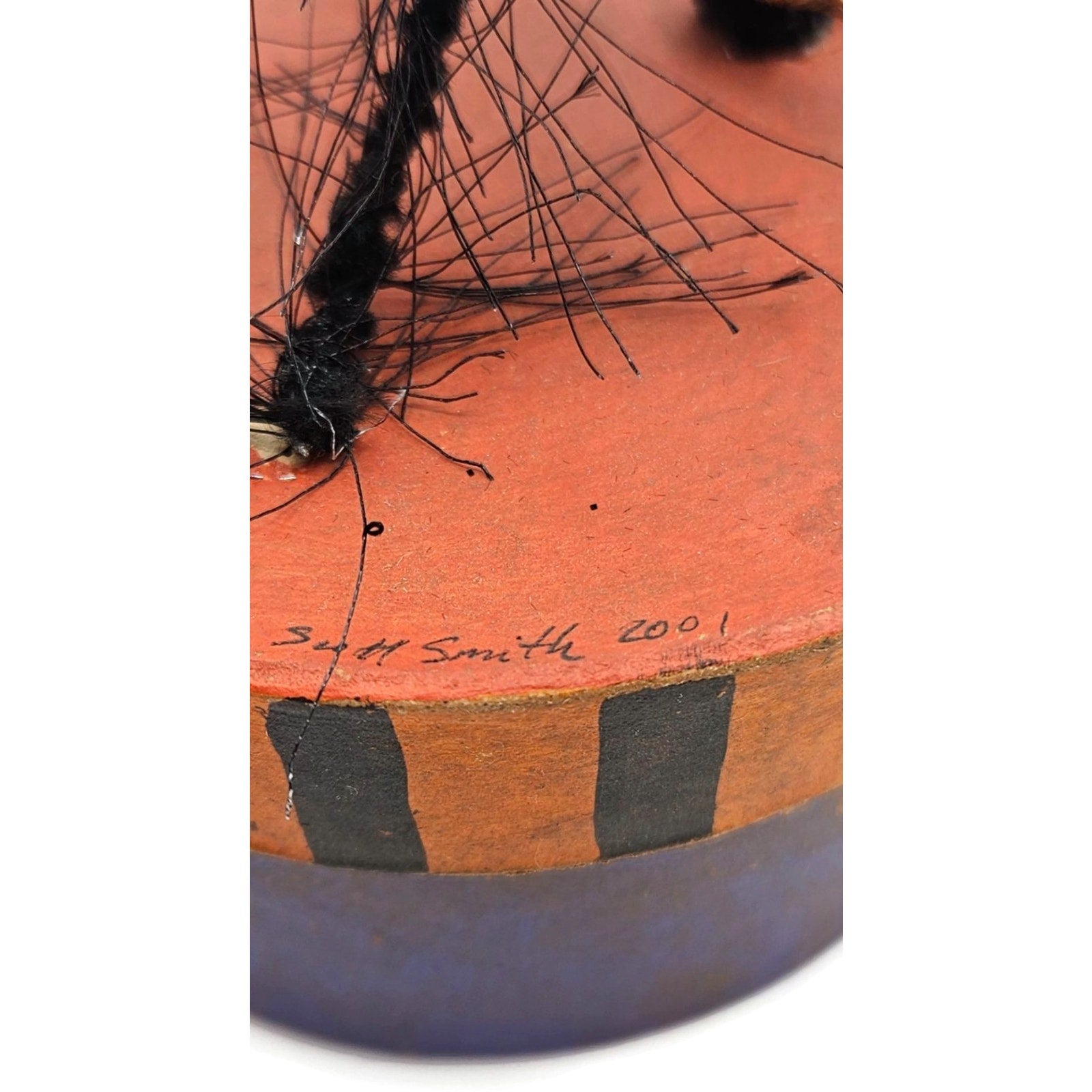 This “Brat Cat” (2001) figure features Scott Smith’s unmistakable vintage-inspired style, combining hand-painted detail, whimsical expression, and quality craftsmanship. Standing on a round box base, the mischievous black cat wears a bright orange crepe ruff and has that classic dual-faced expression collectors love.