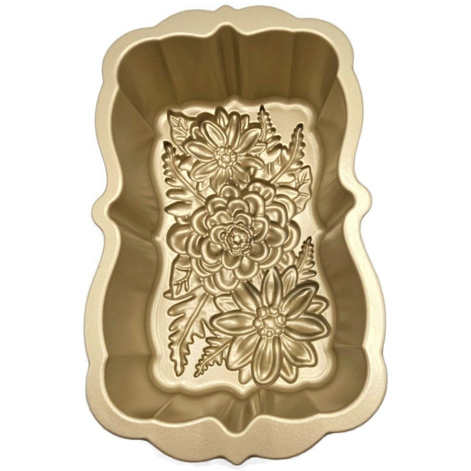 The pan creates a stunning loaf cake or quick bread with an intricate, three-dimensional design of blooming wildflowers on the surface. Its superior cast aluminum construction ensures uniform baking and browning, while the premium non-stick coating allows for easy release.