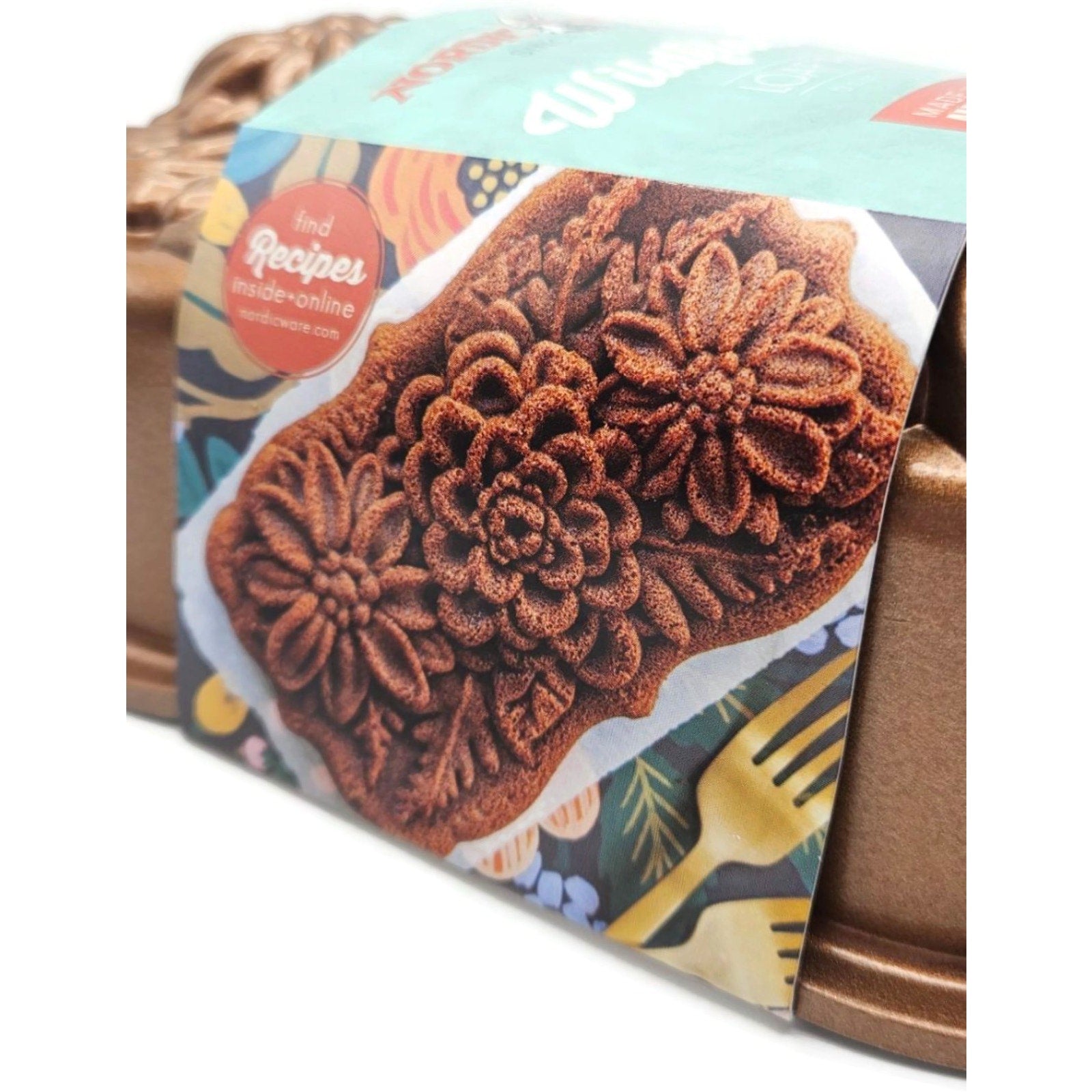 This pan creates a stunning loaf cake or bread with a detailed three-dimensional design of blooming wildflowers on top. The bronze color adds a lovely rustic finish.